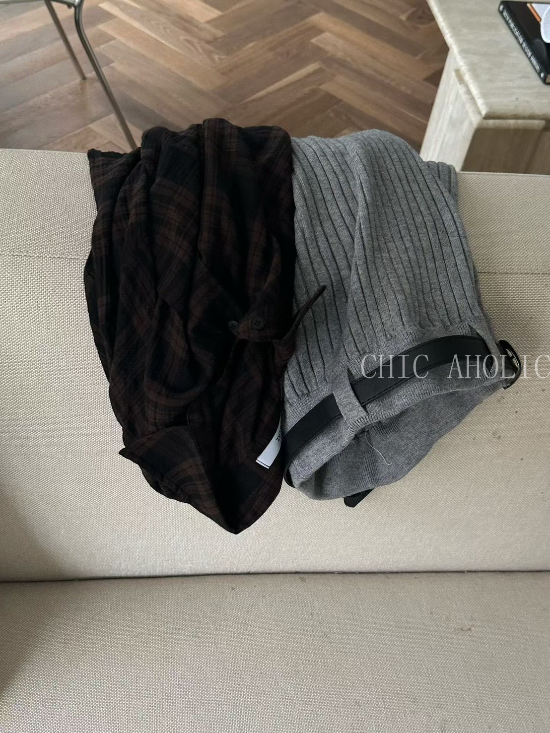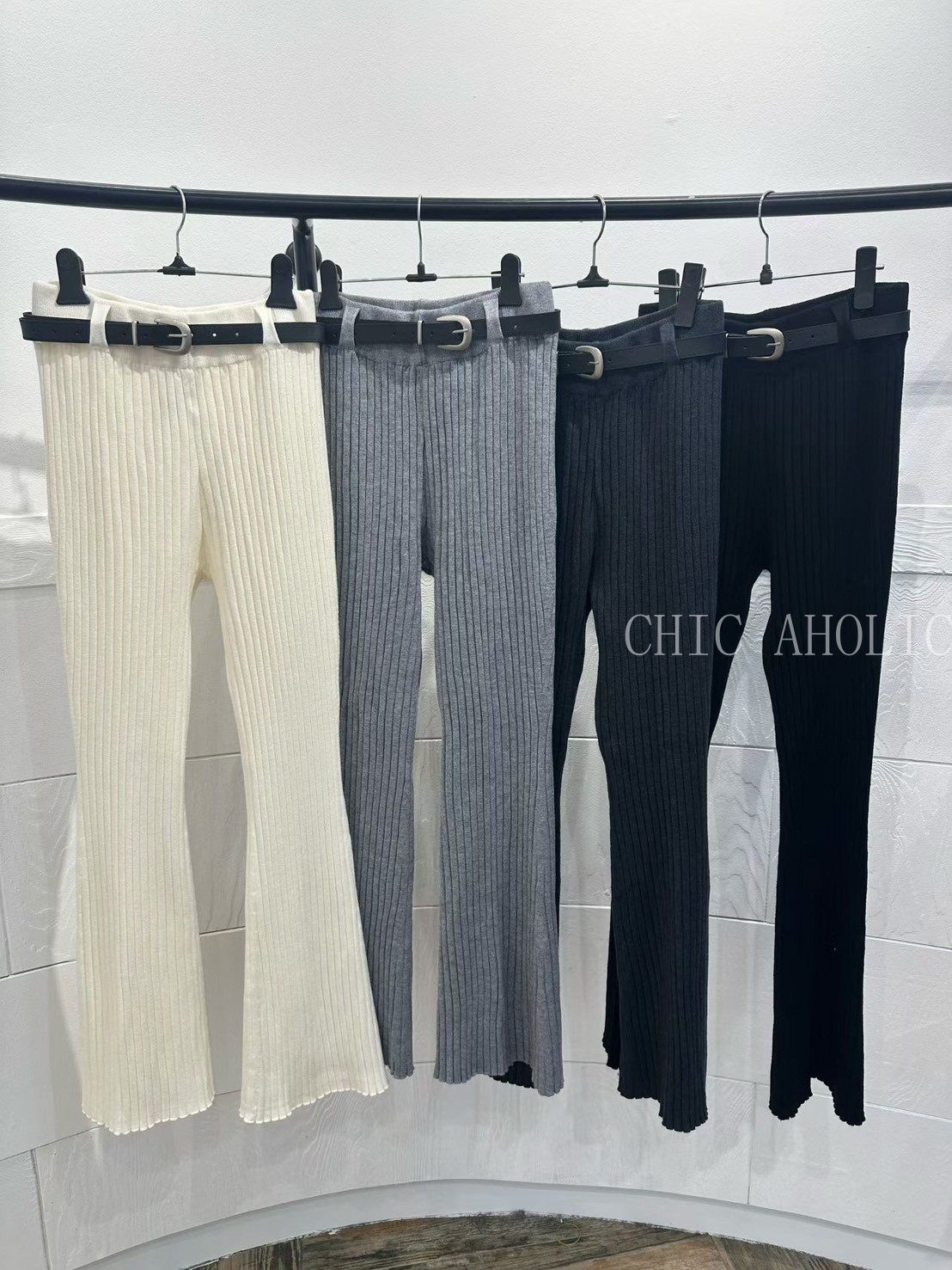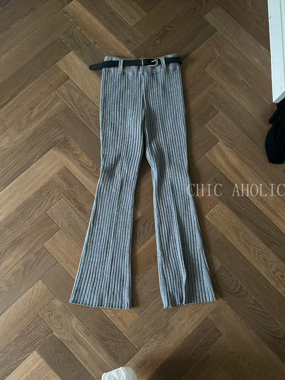 坑條微喇叭附皮帶長褲