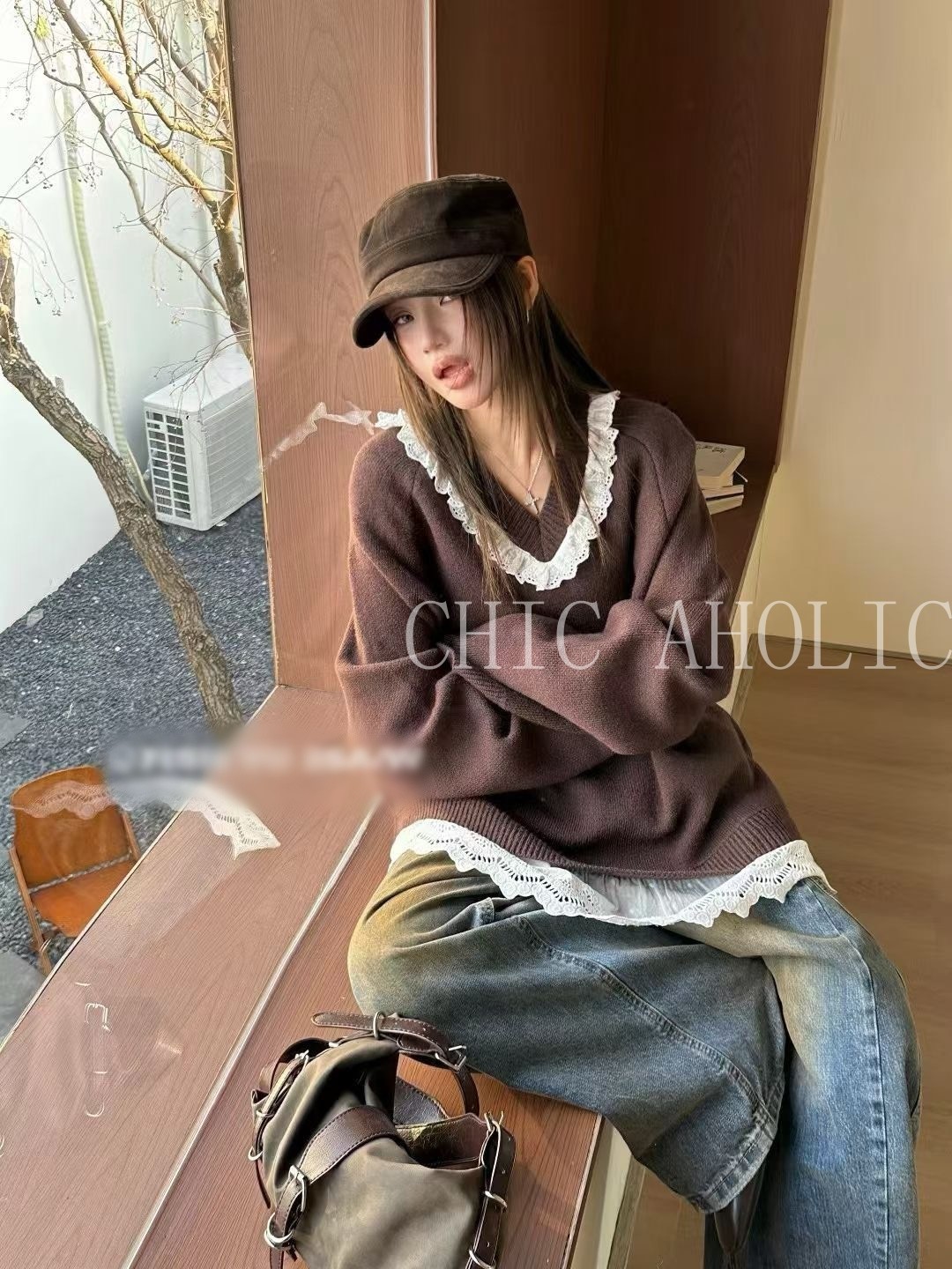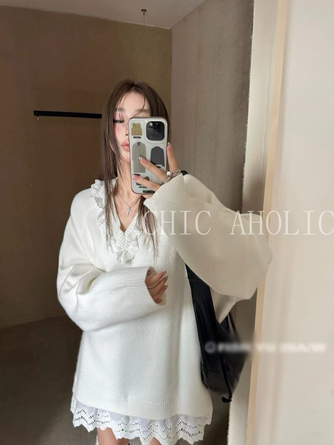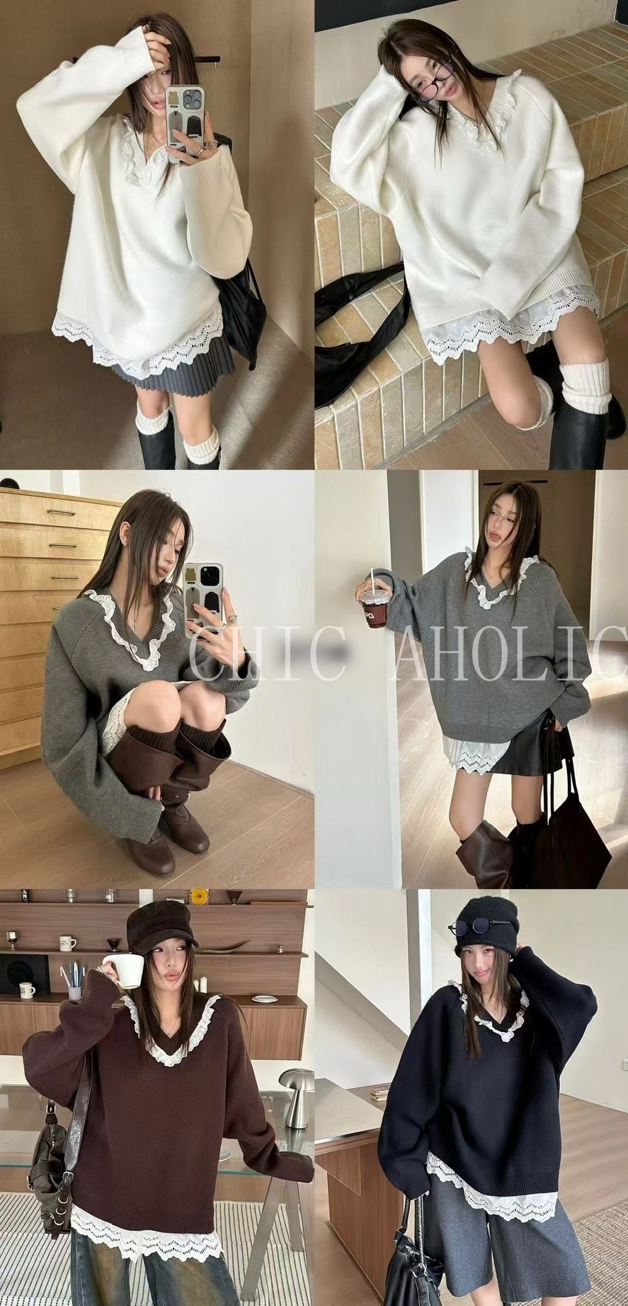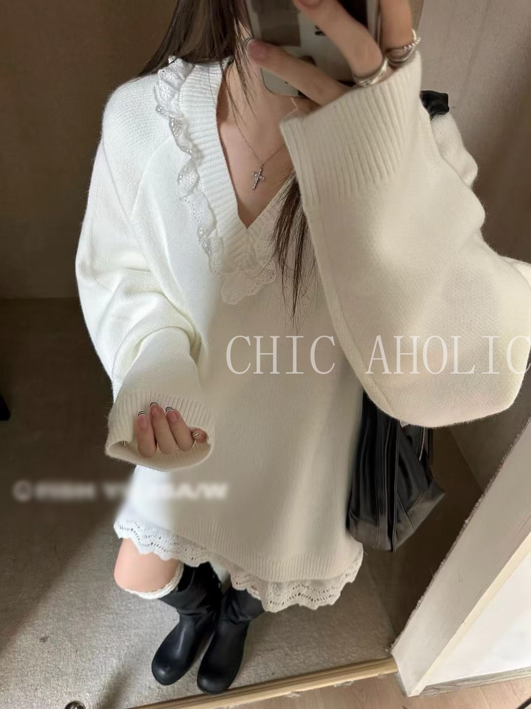 WN42白蕾絲拚V領寬針織衣