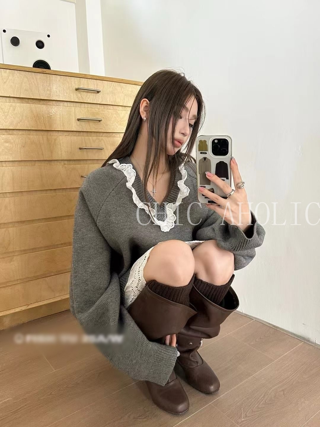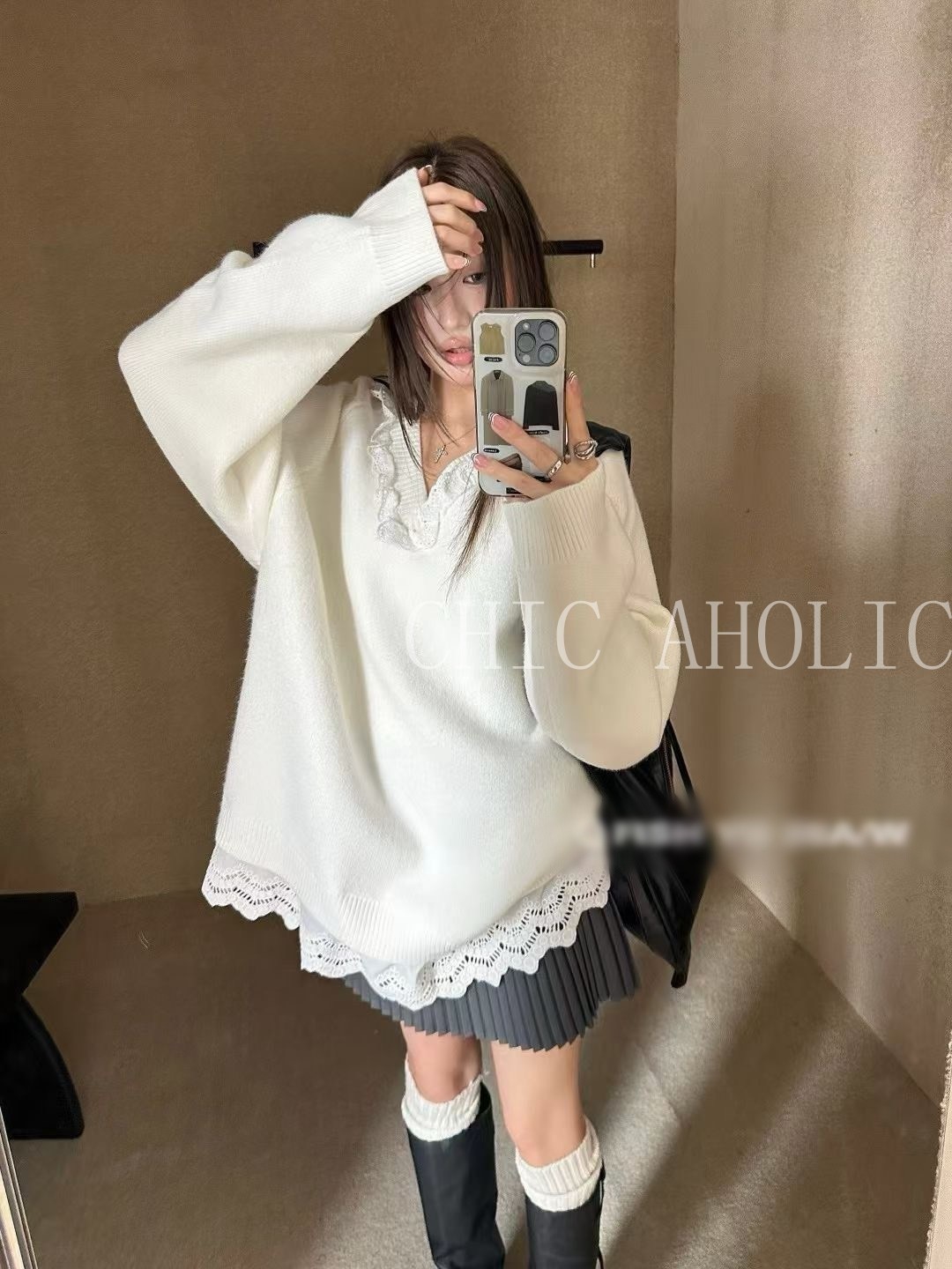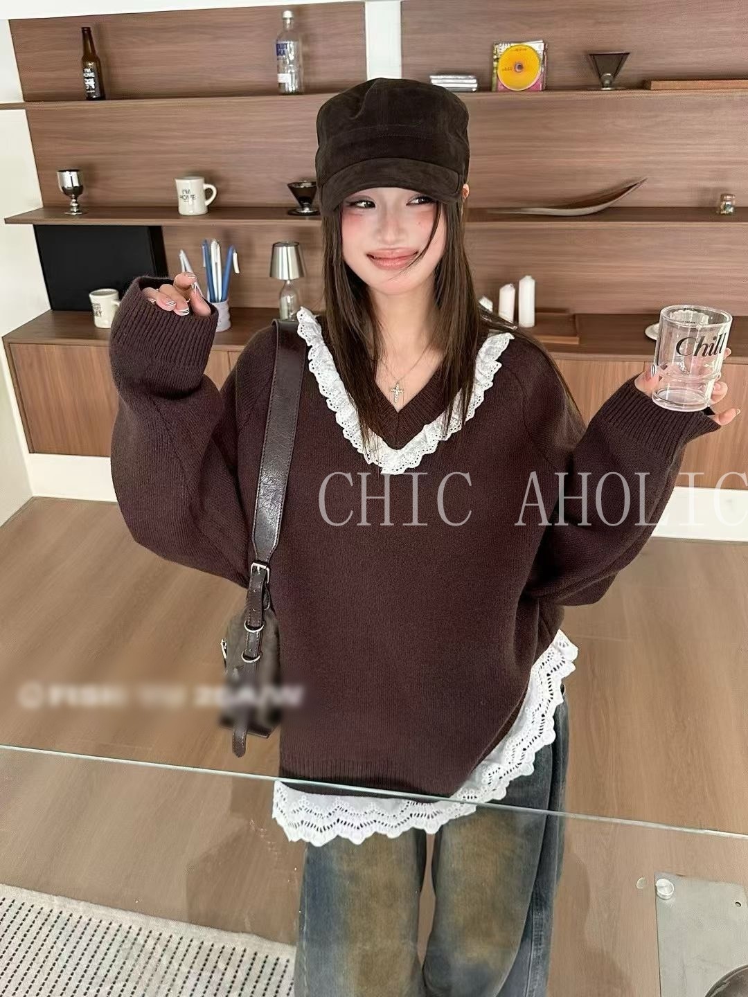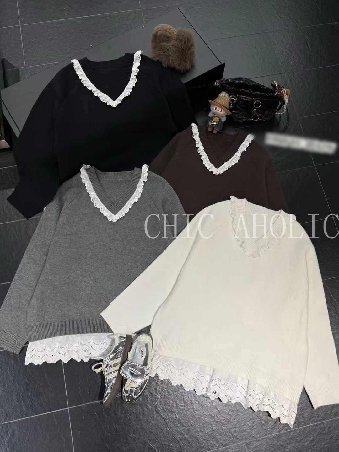 WN42白蕾絲拚V領寬針織衣