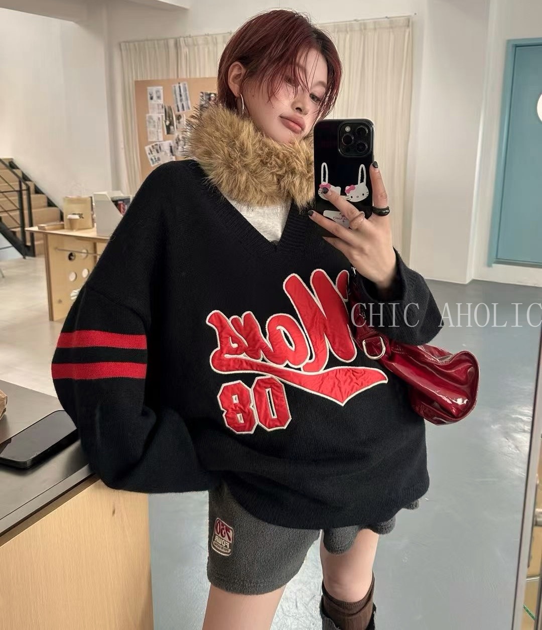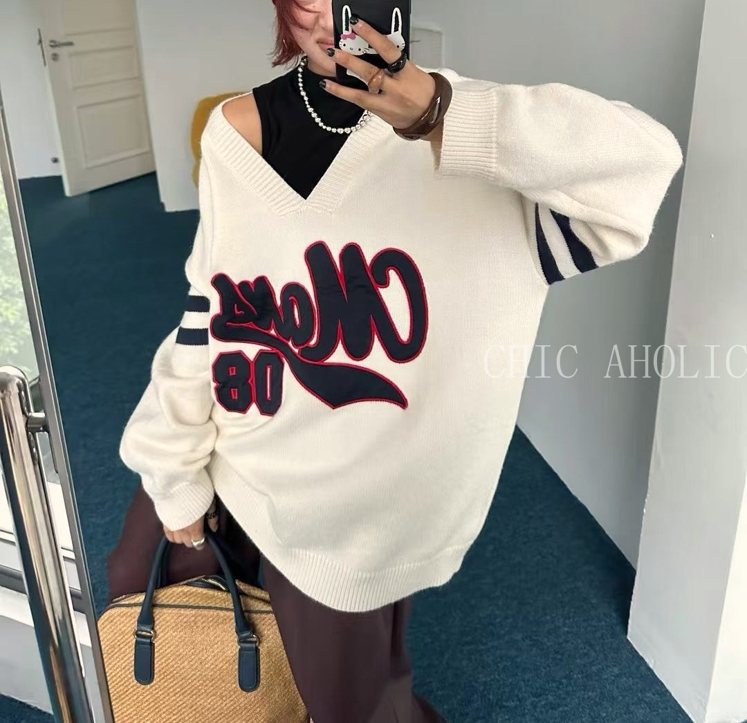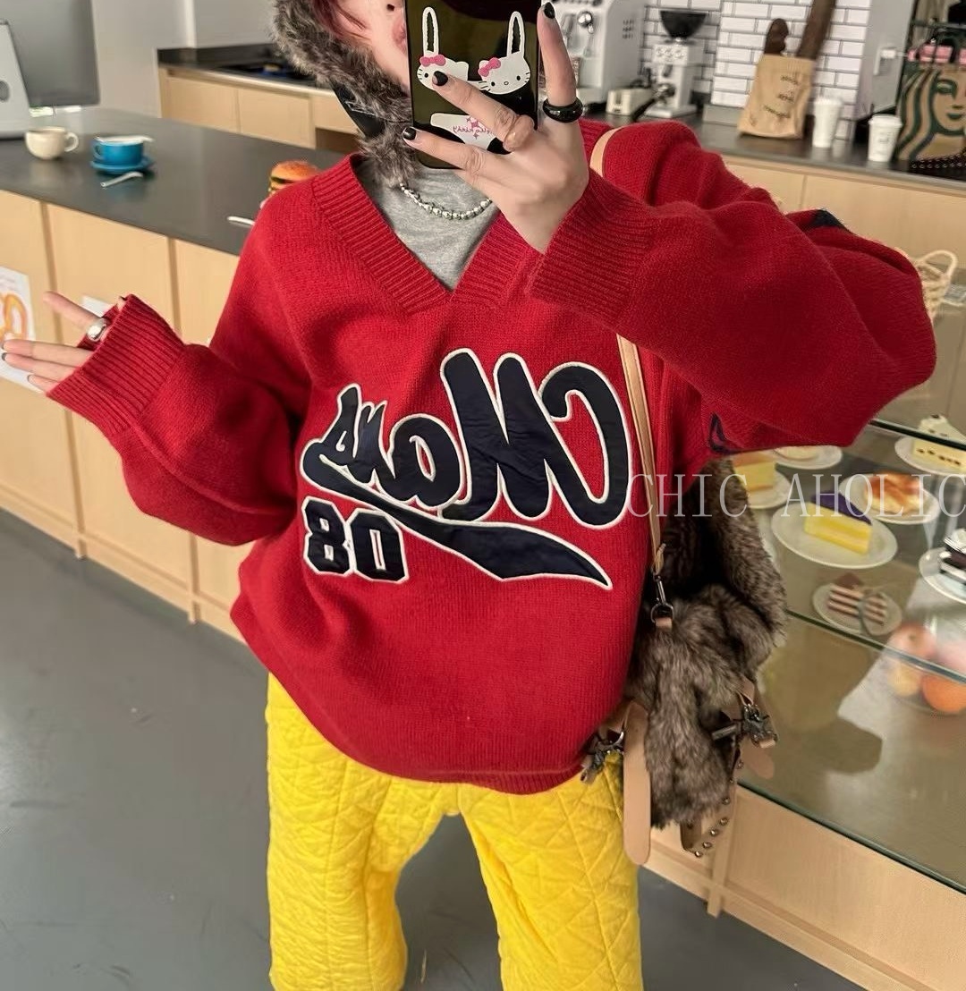 HH19紅雙條袖大字母大針織衣