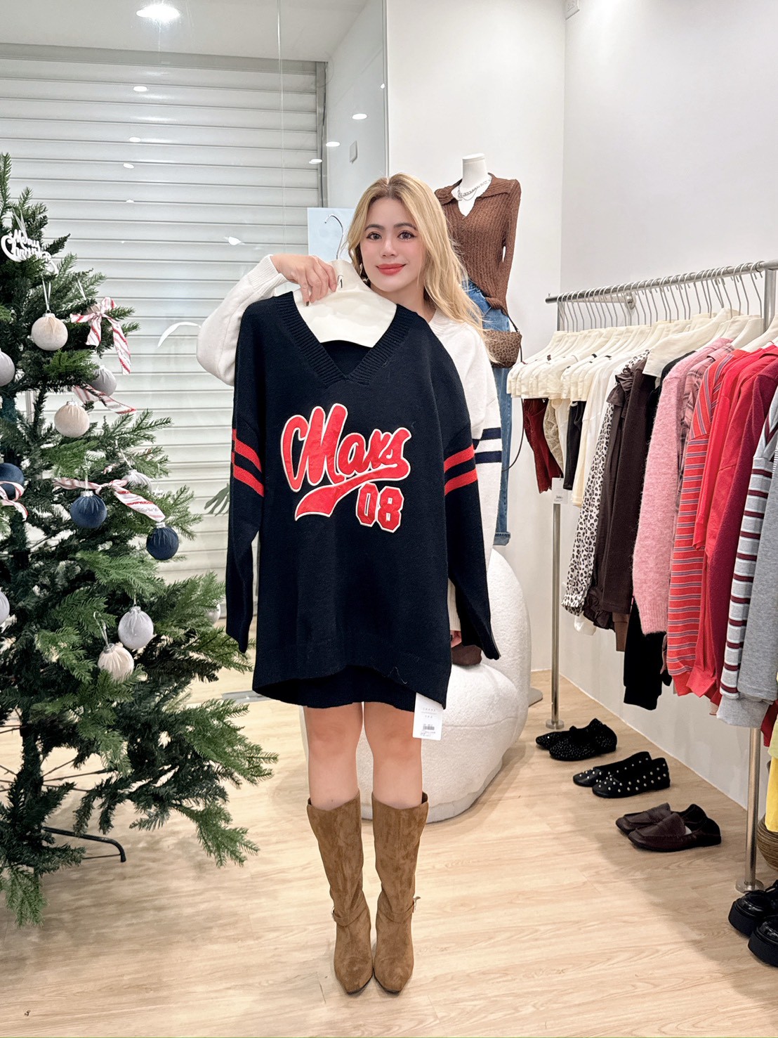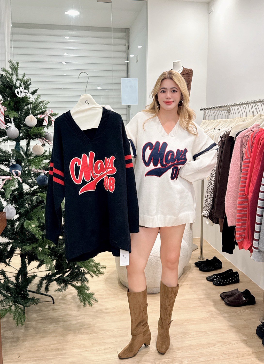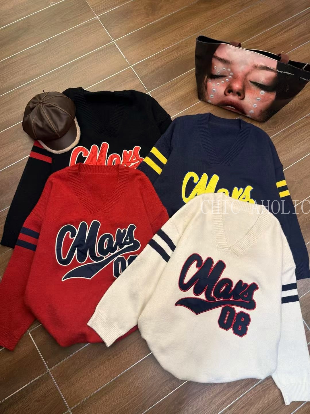 HH19紅雙條袖大字母大針織衣