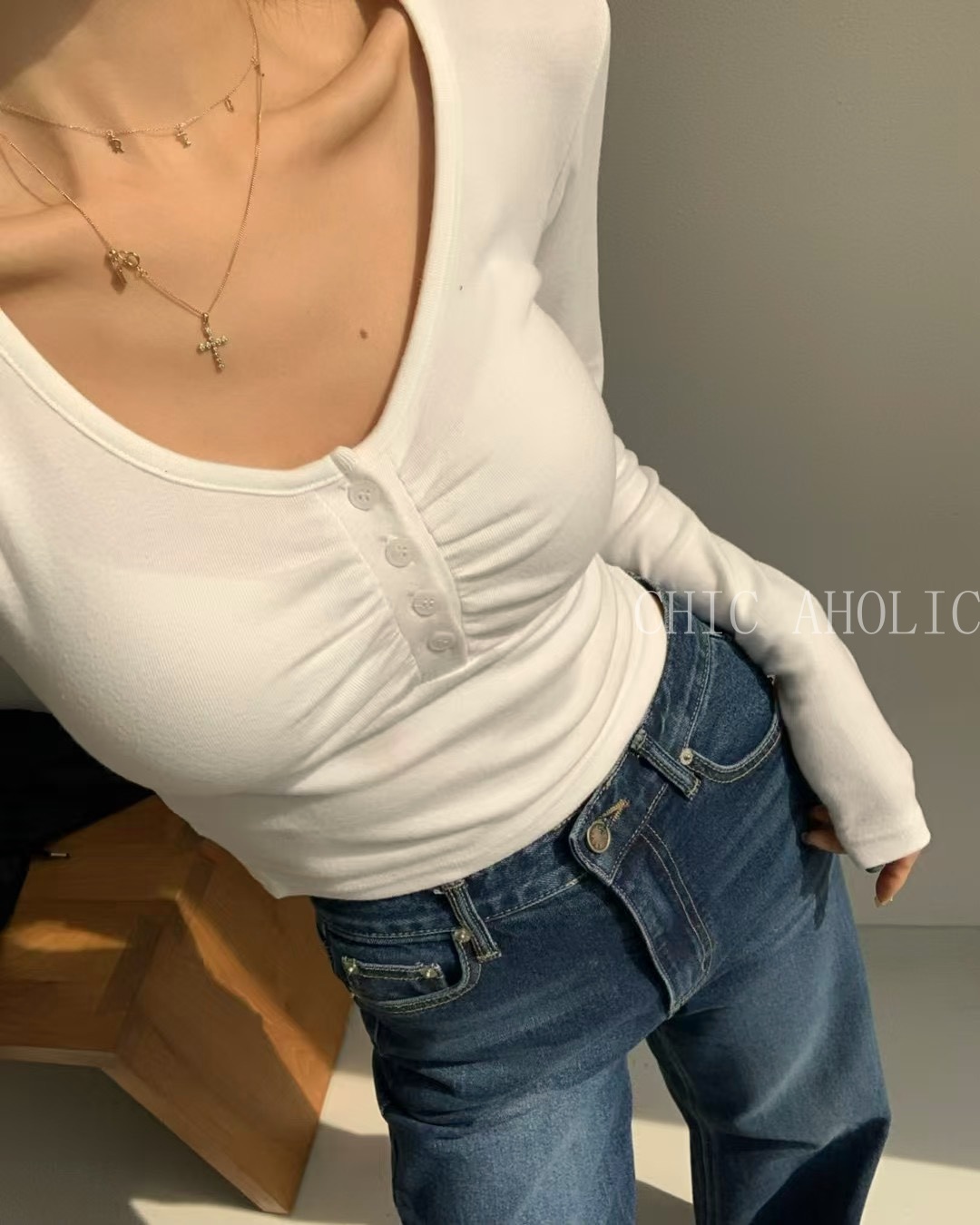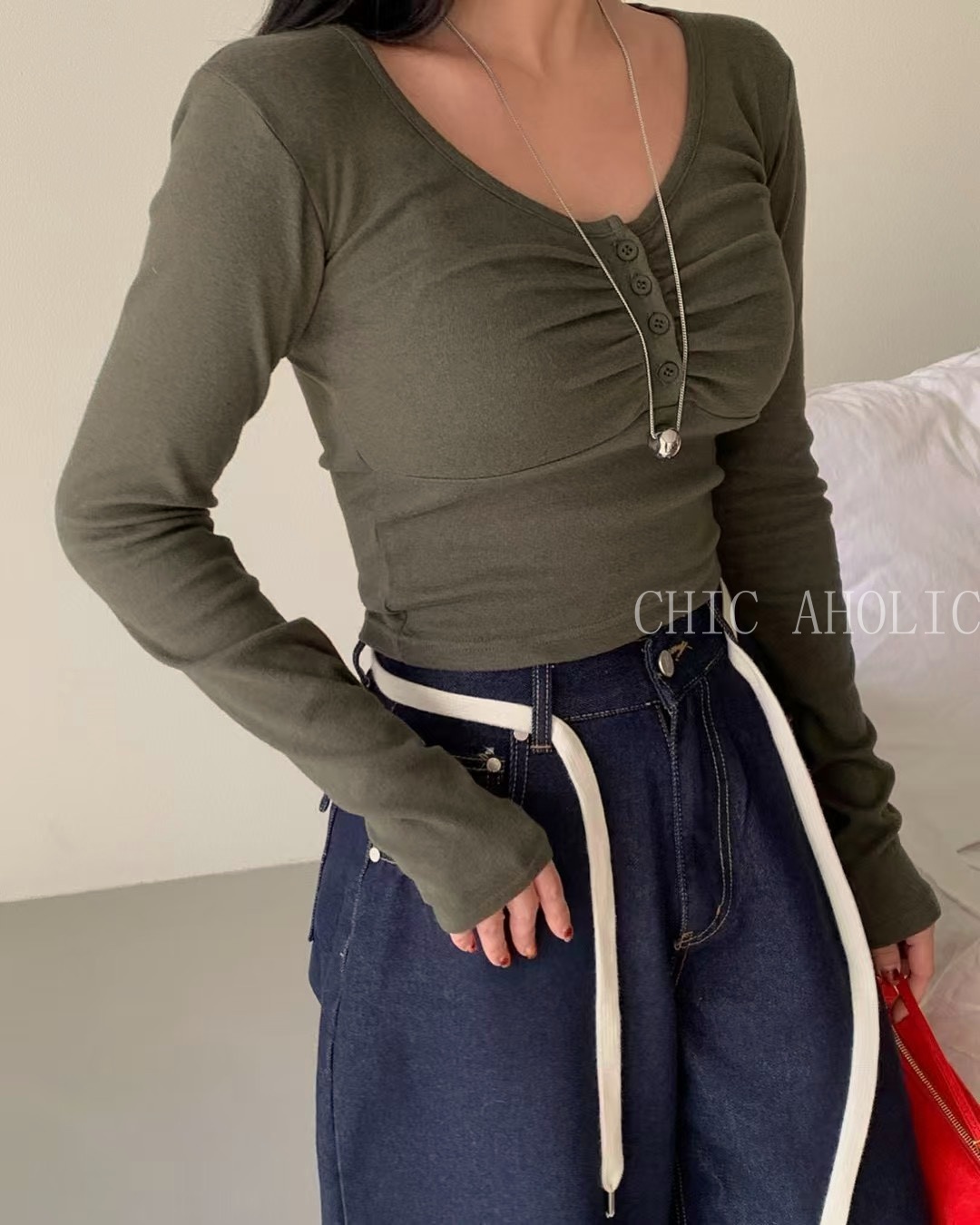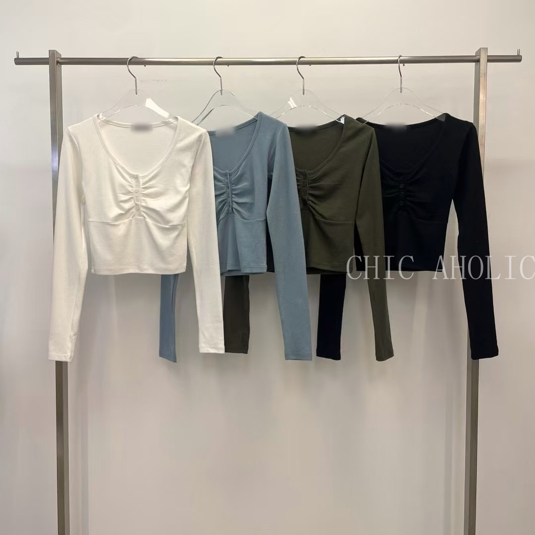 胸口抓褶4釦上衣
