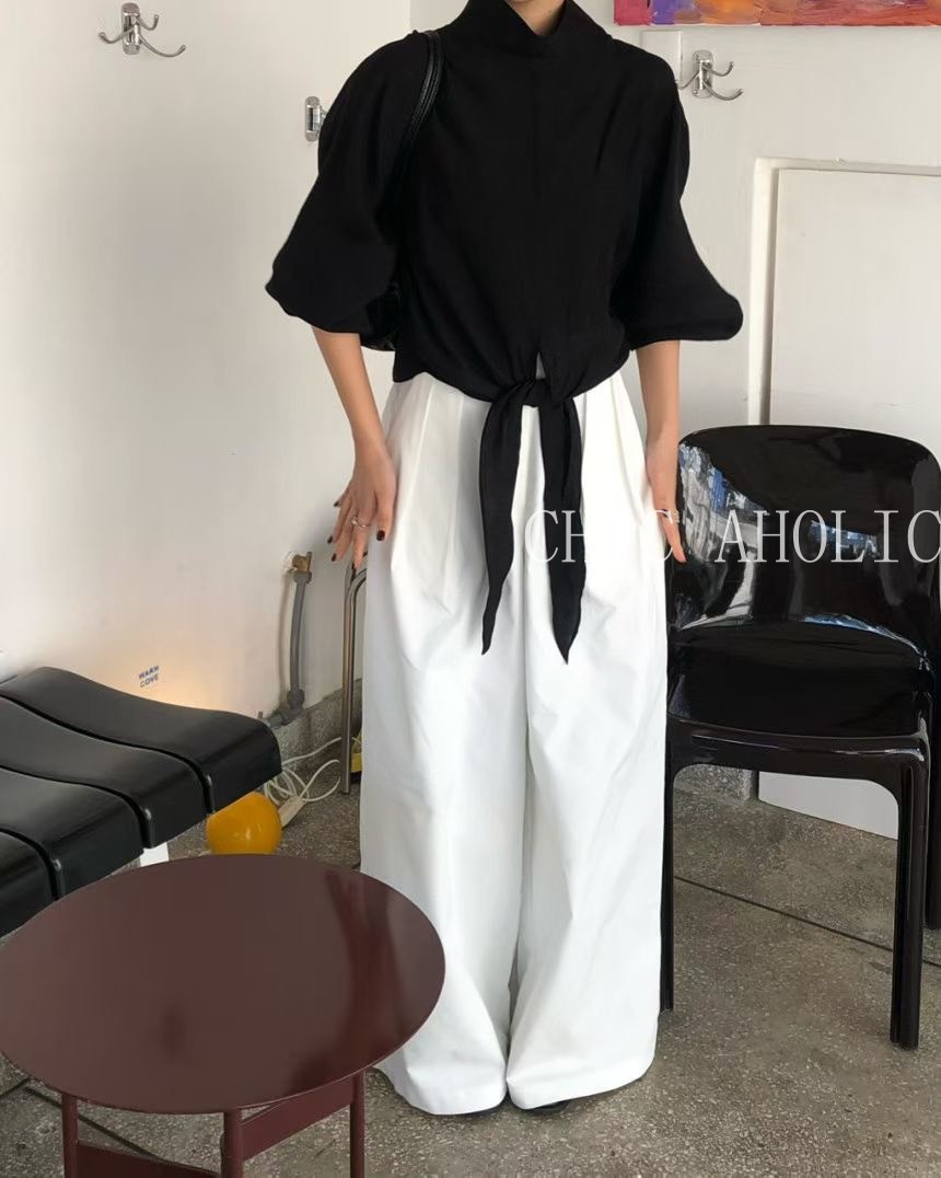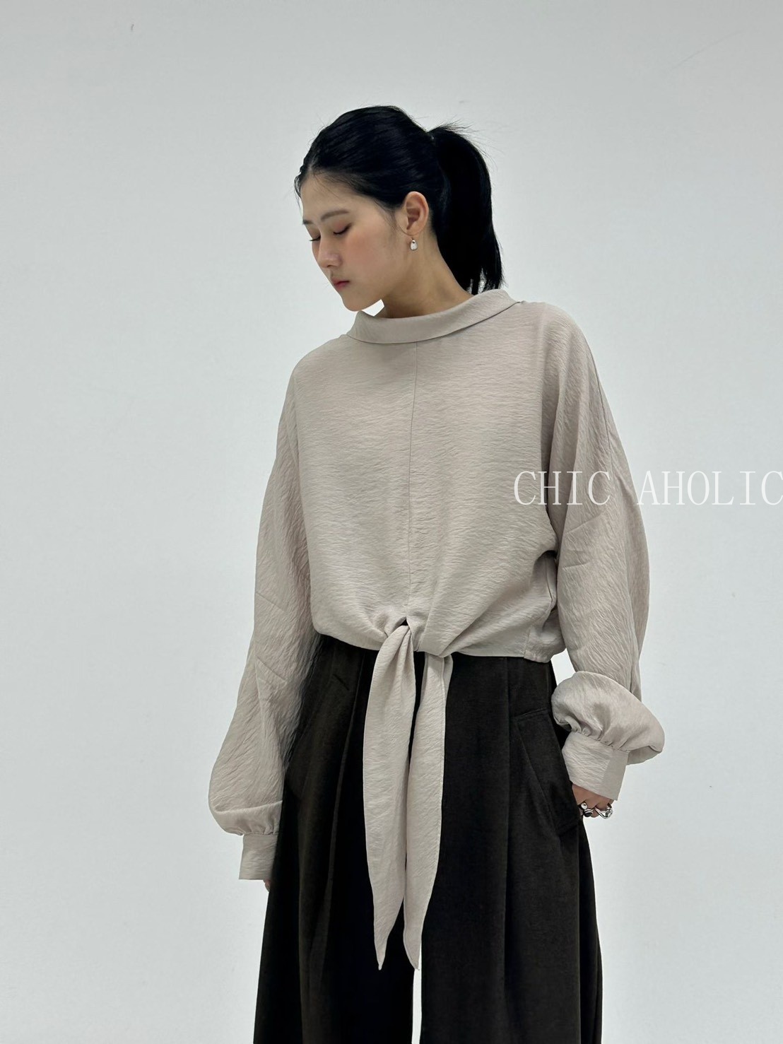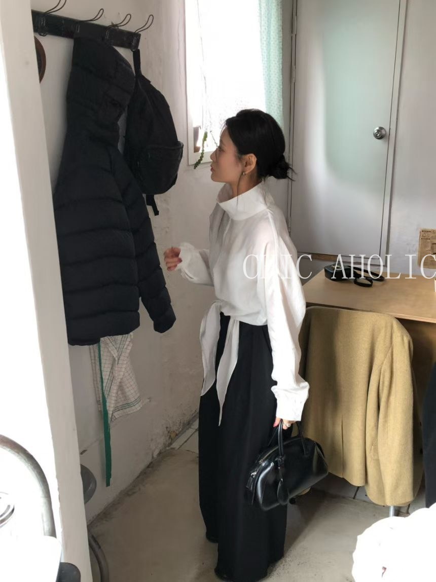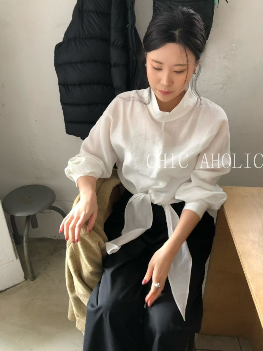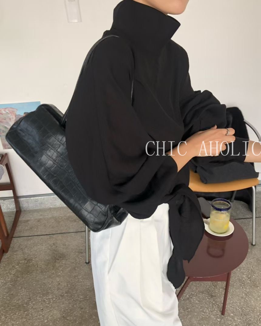 TW21鬆弛高領綁結下擺雪紡衣