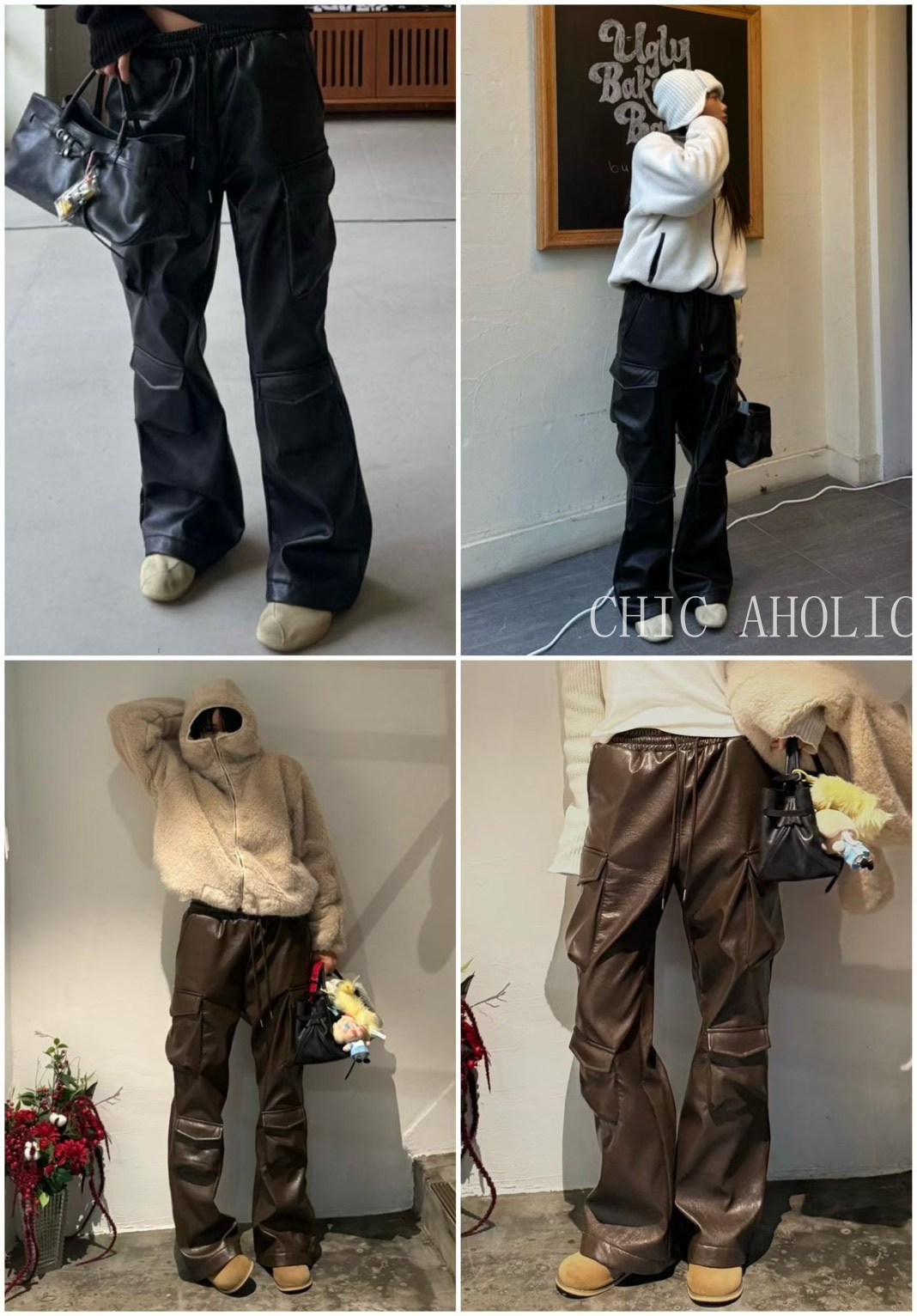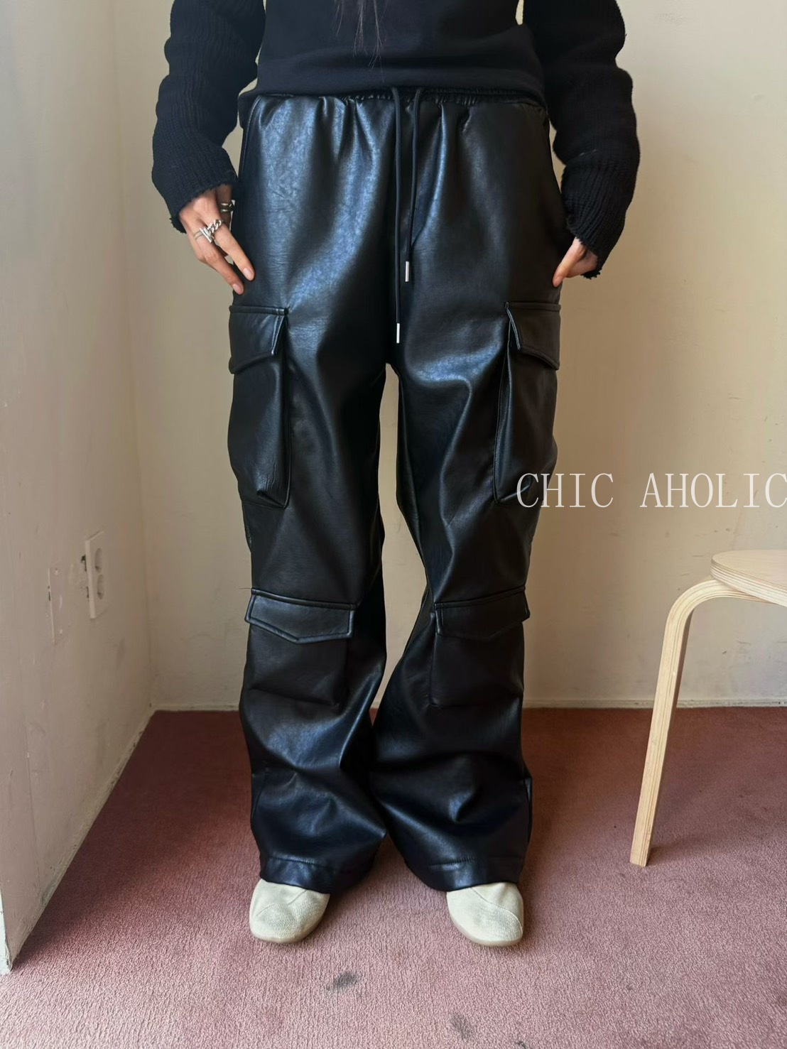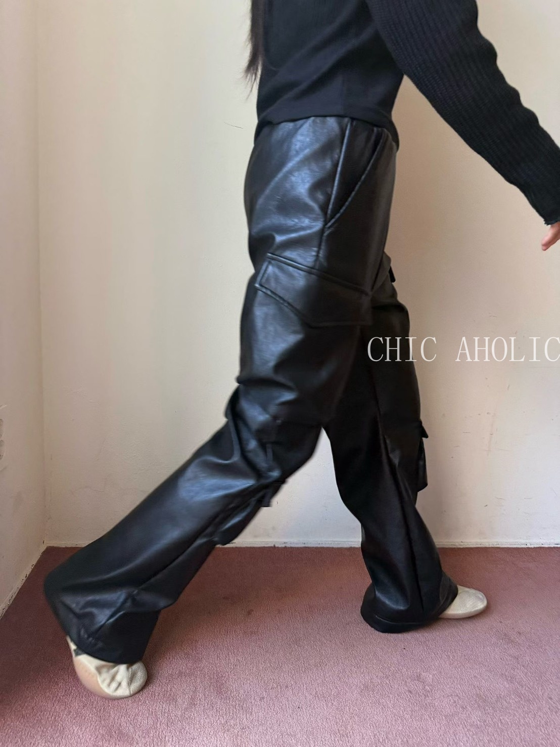 TW27亮亮皮革感工裝褲