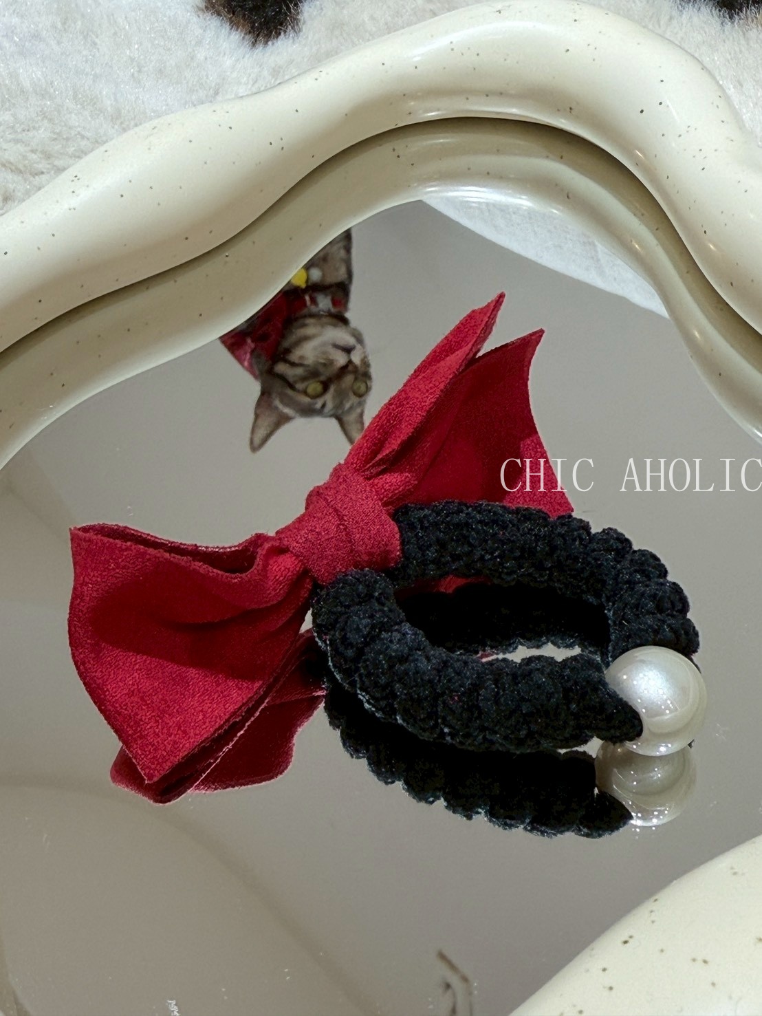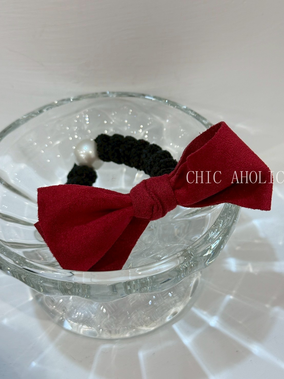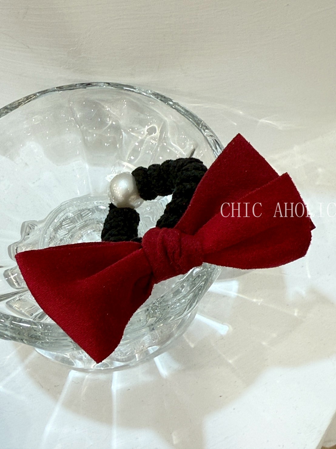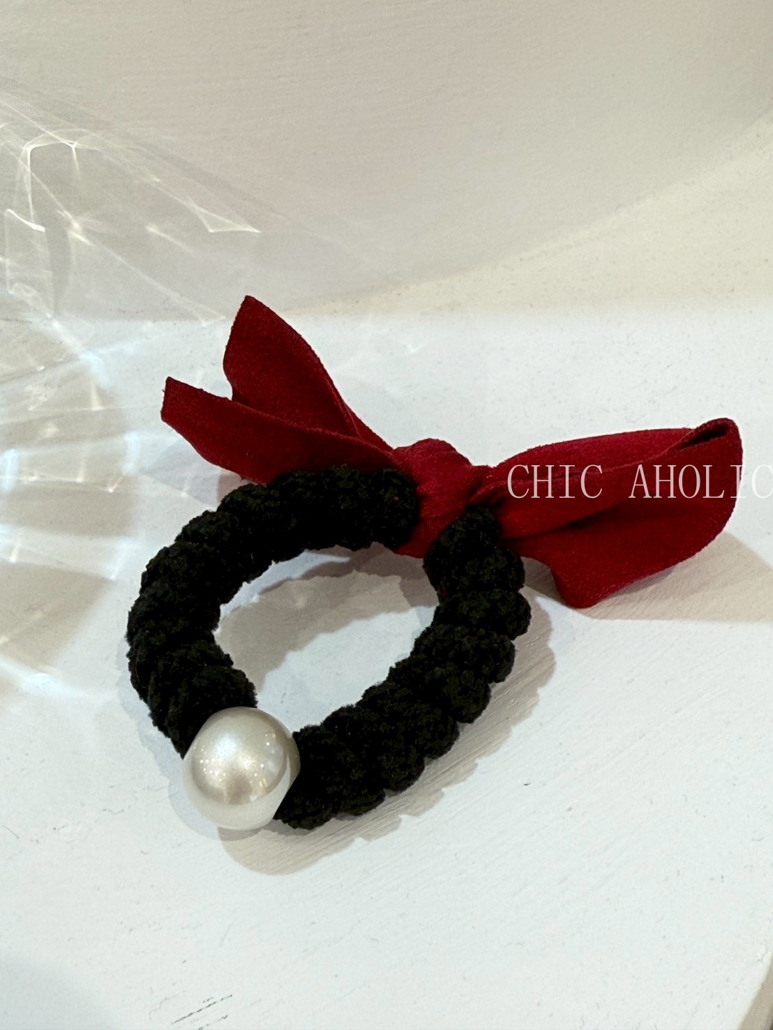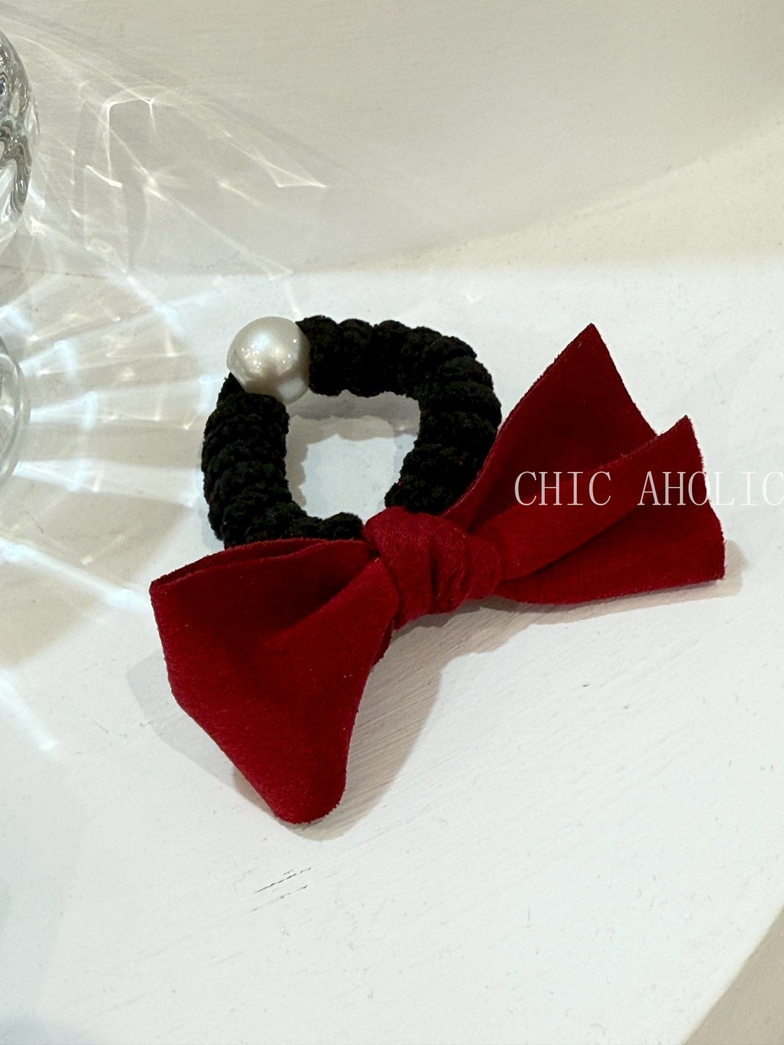 TW43珍珠紅蝴蝶結髮圈