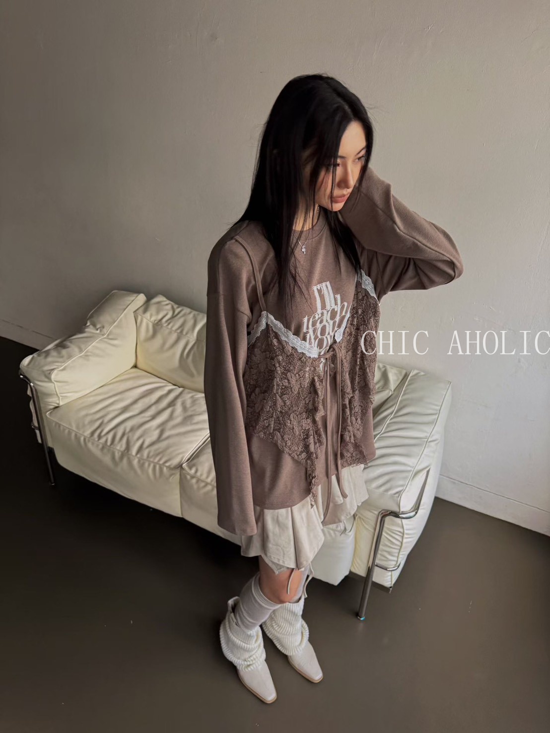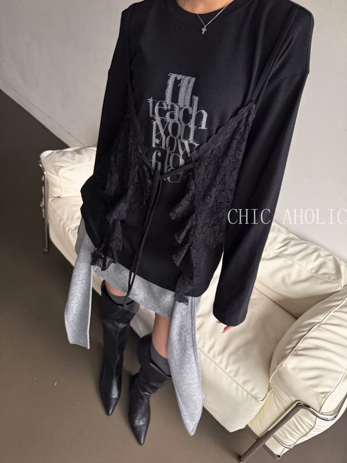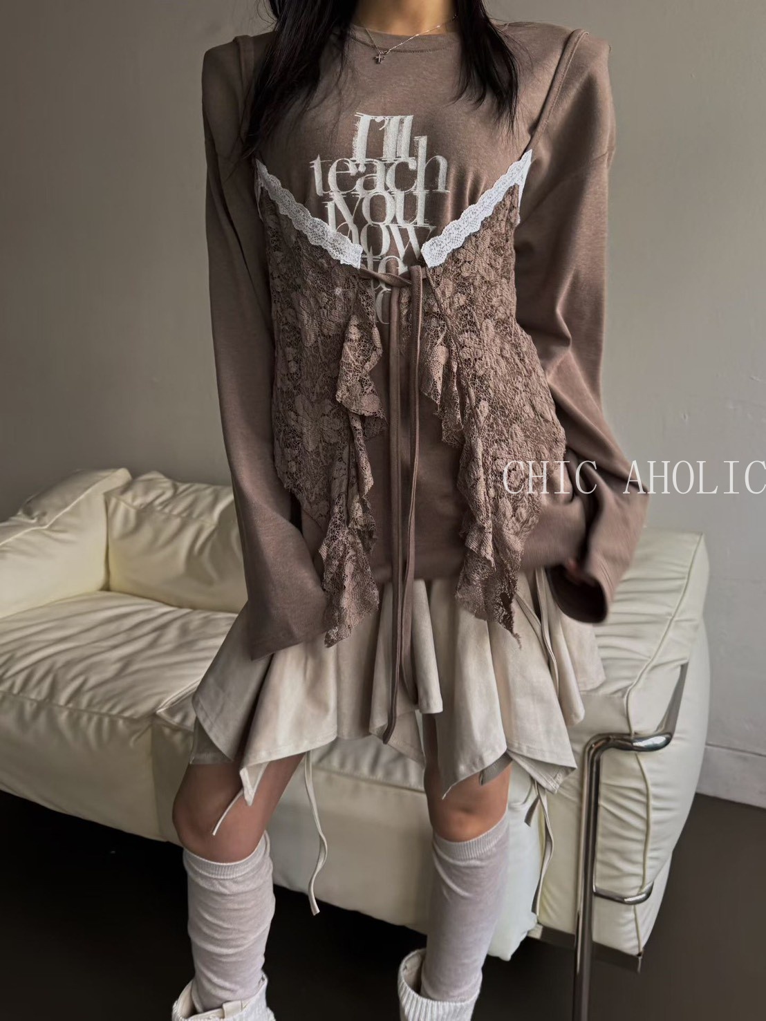 MOM19蕾絲蝴蝶結背心假兩件式衣