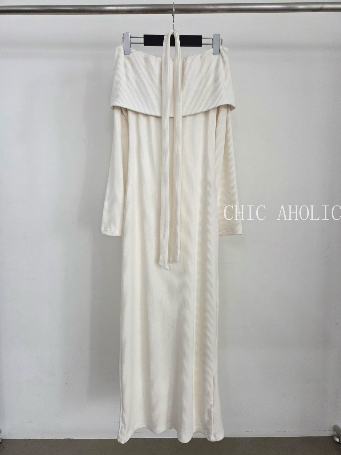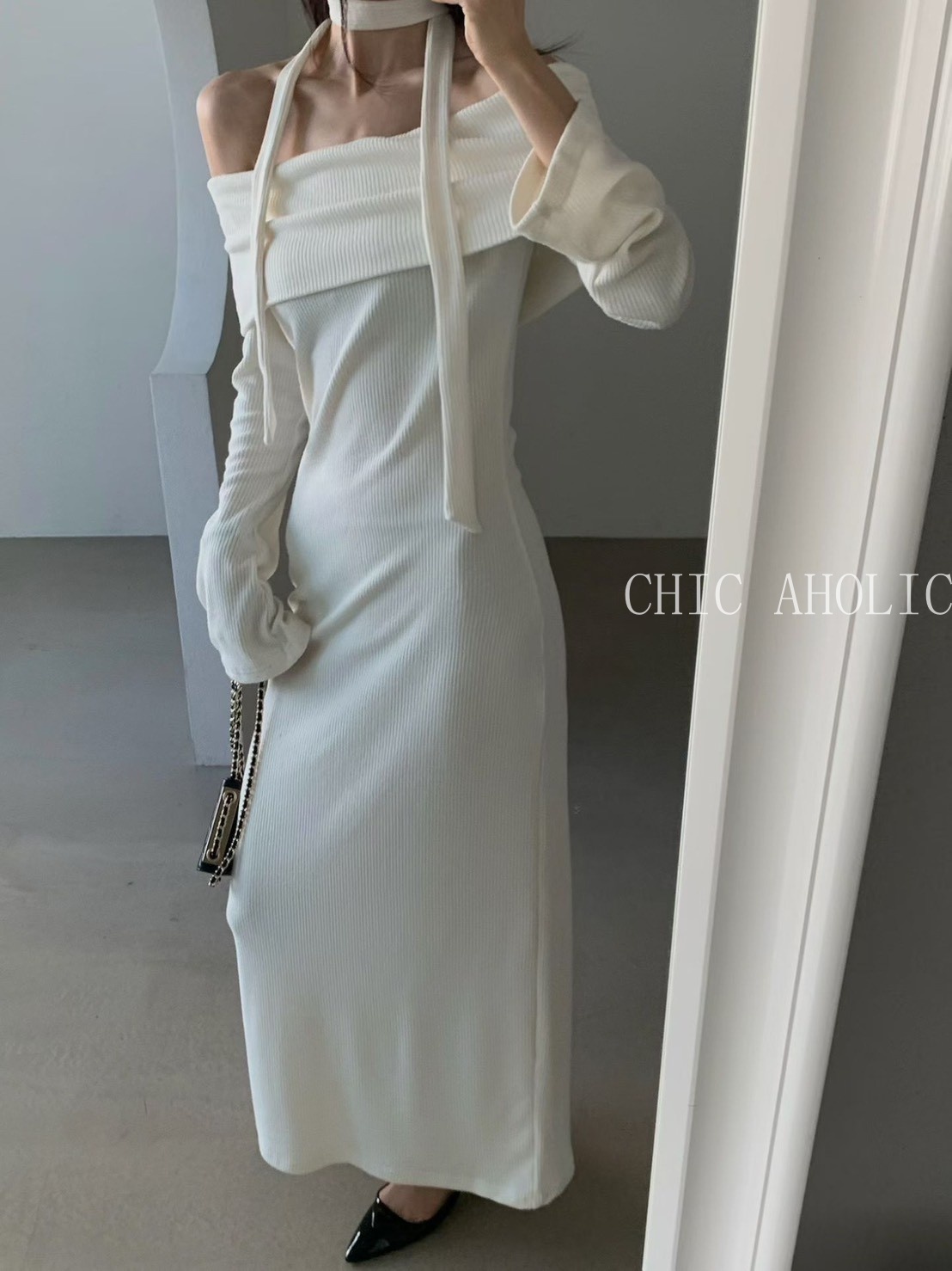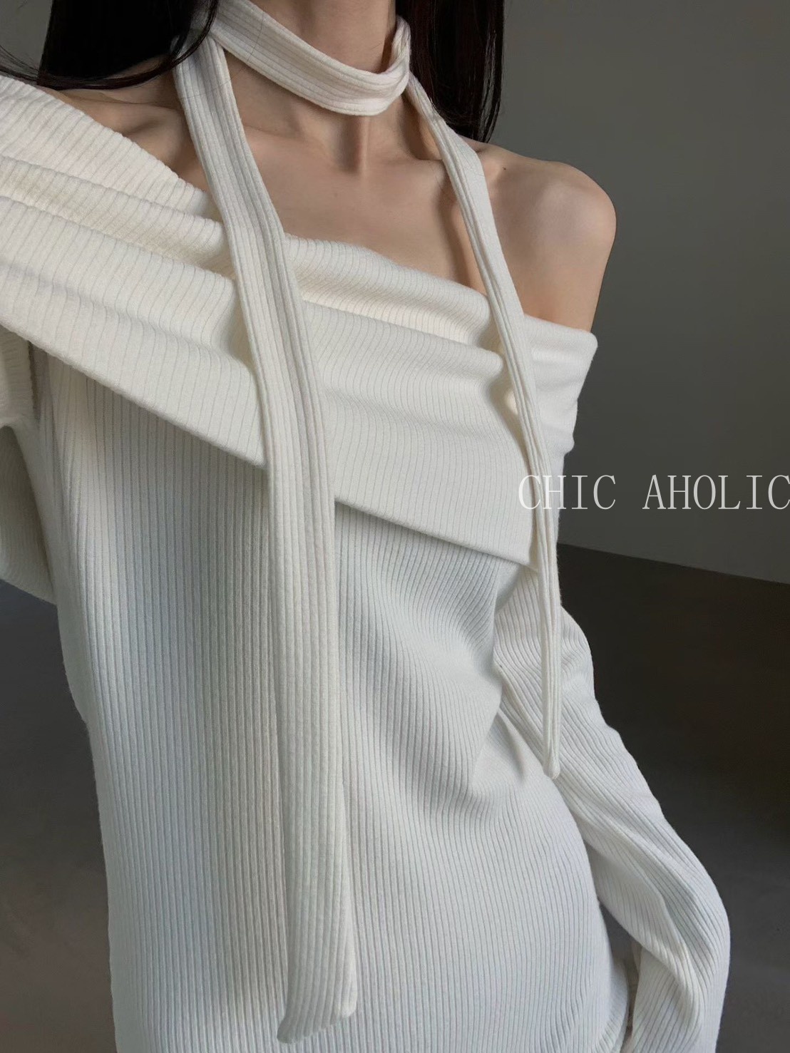 NE59坑條大翻綁脖洋裝