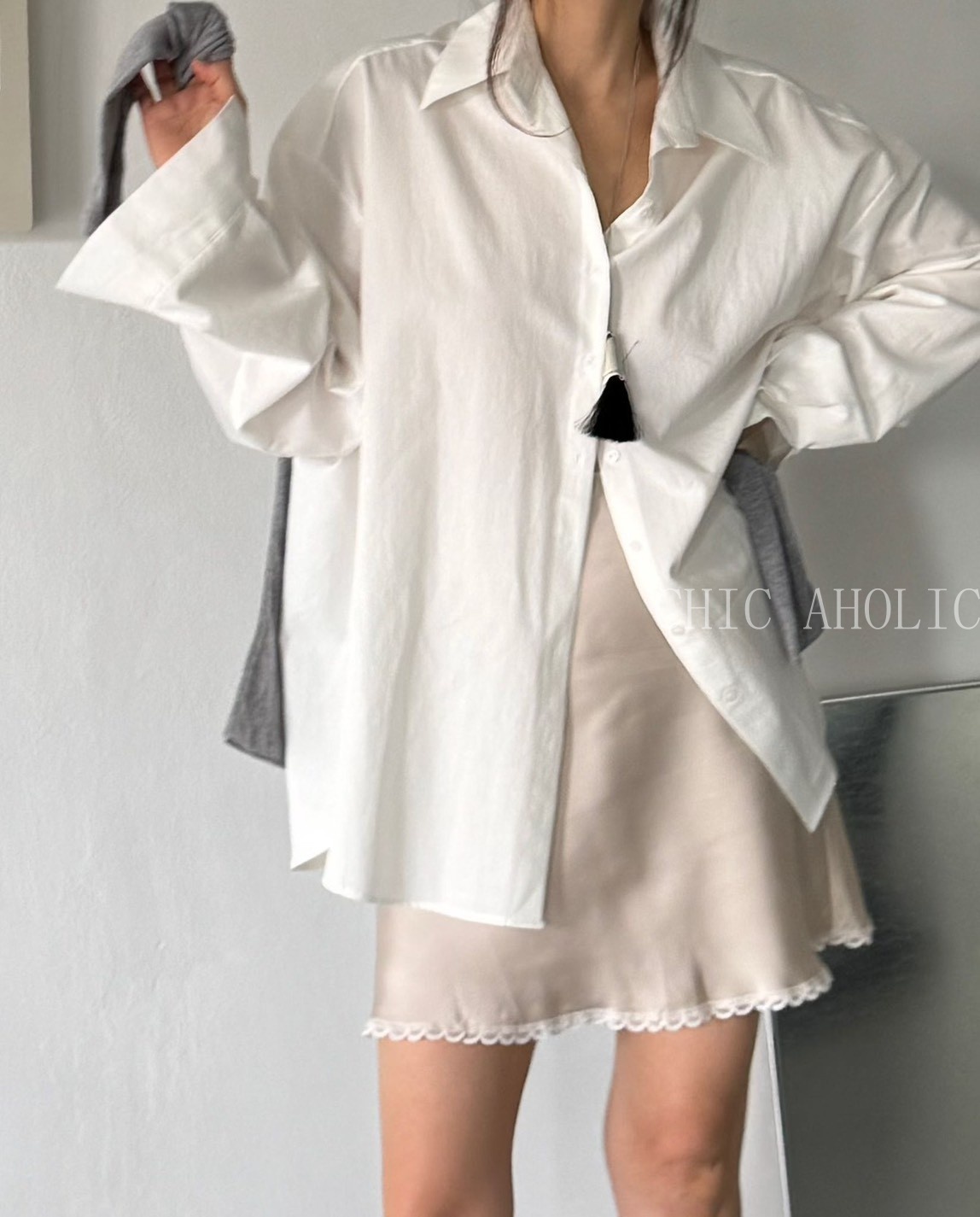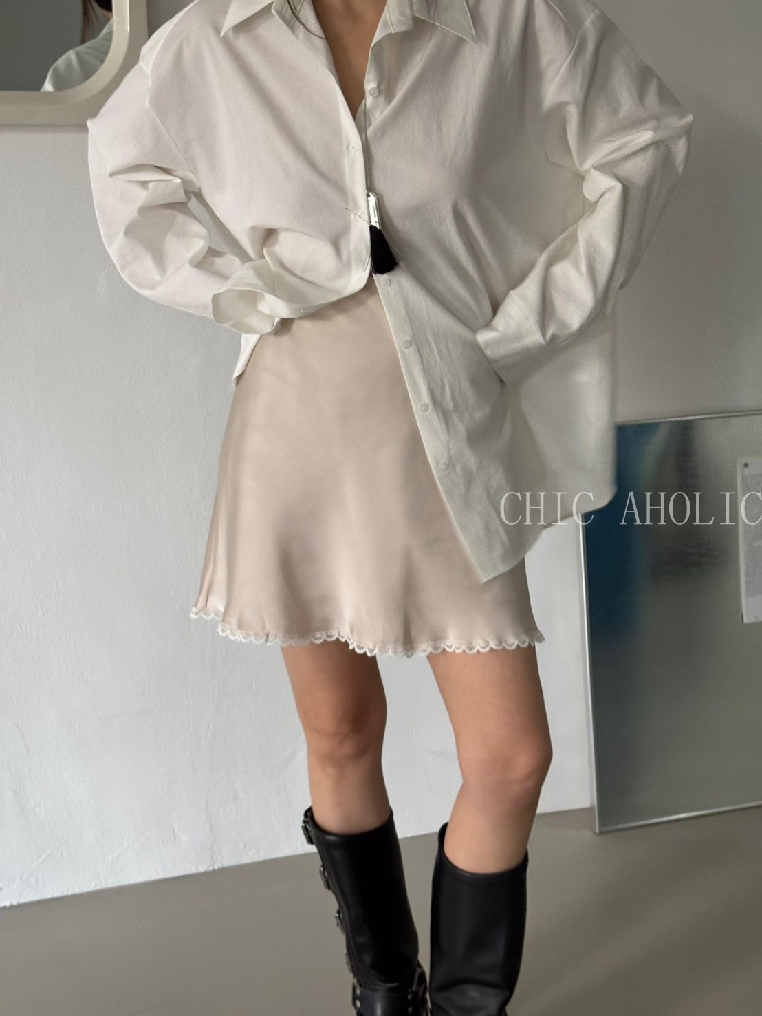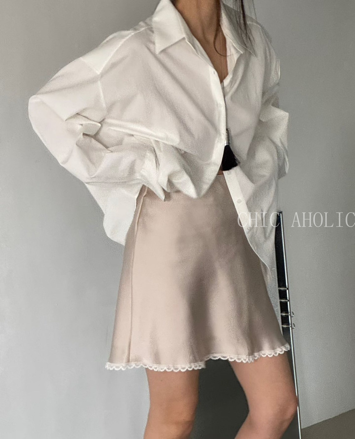 MEE48下擺緞面斜擺上衣