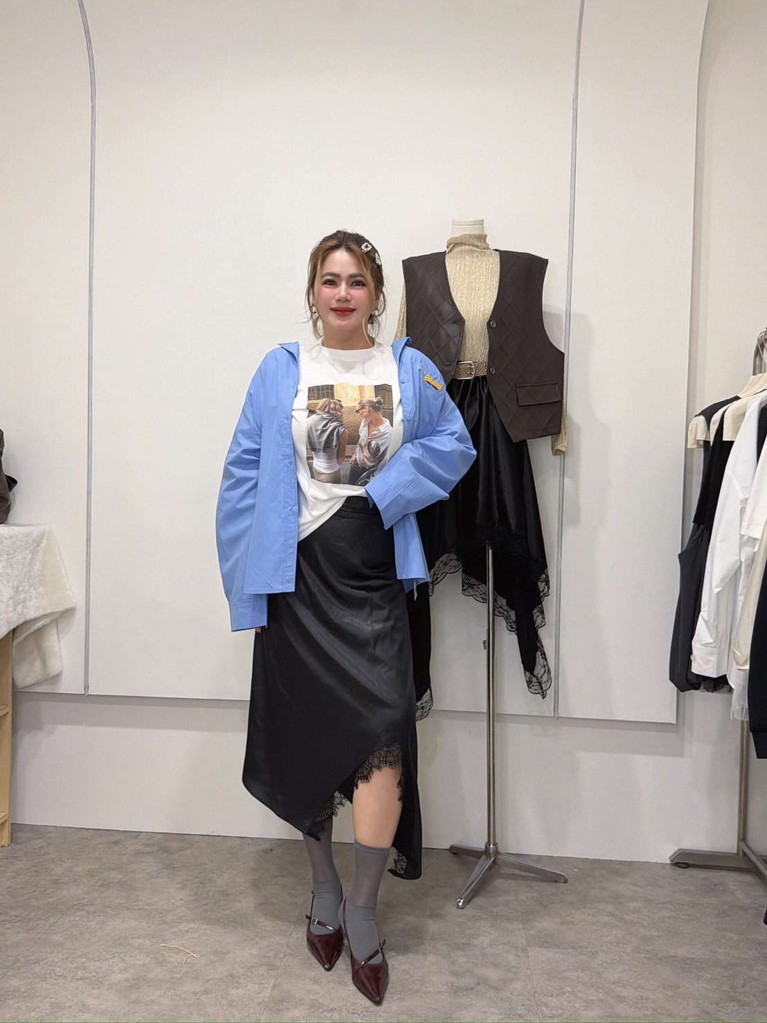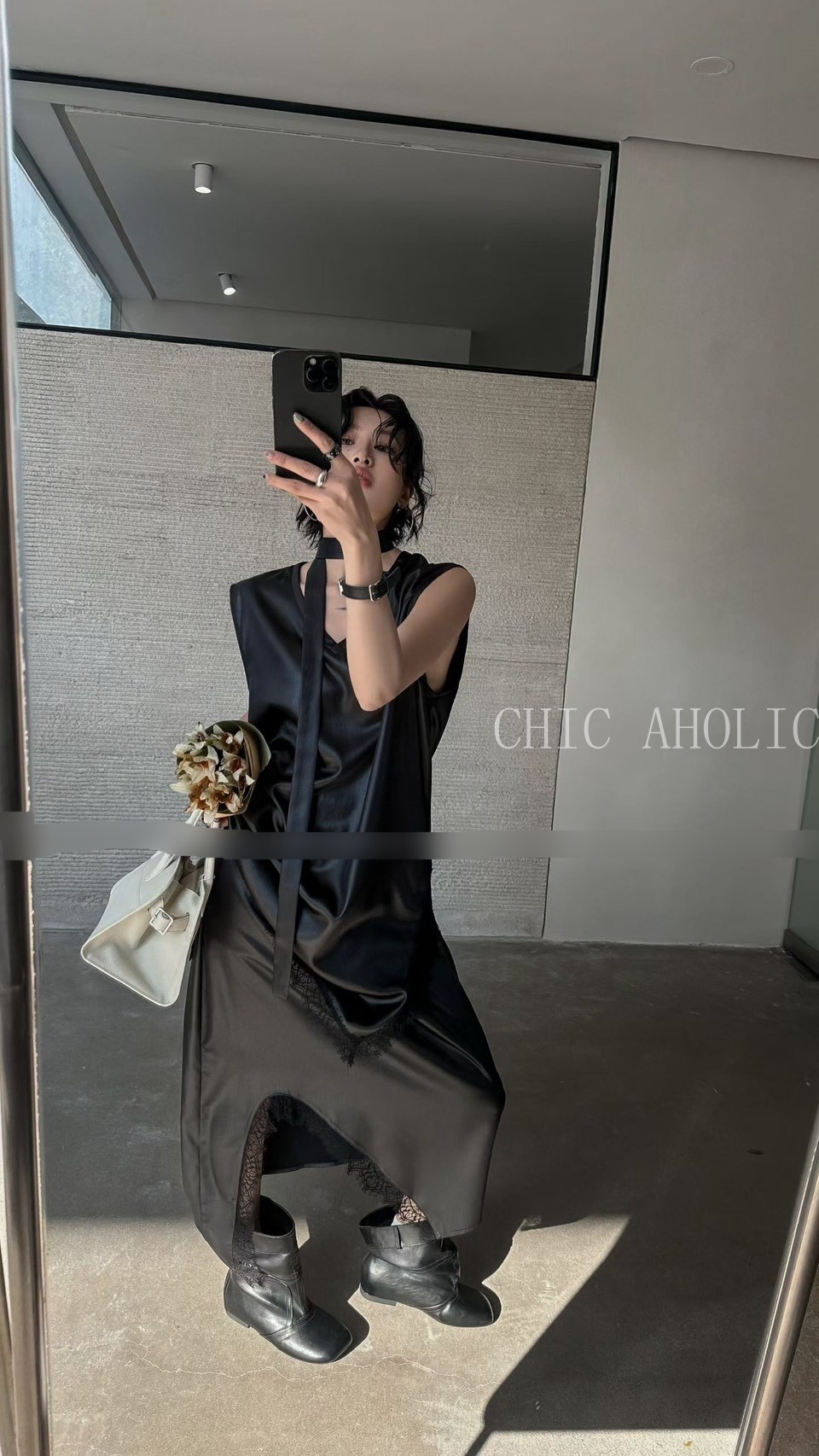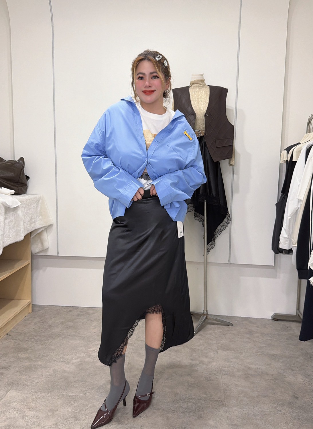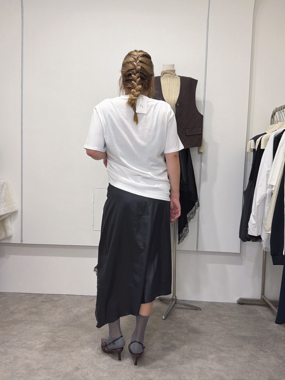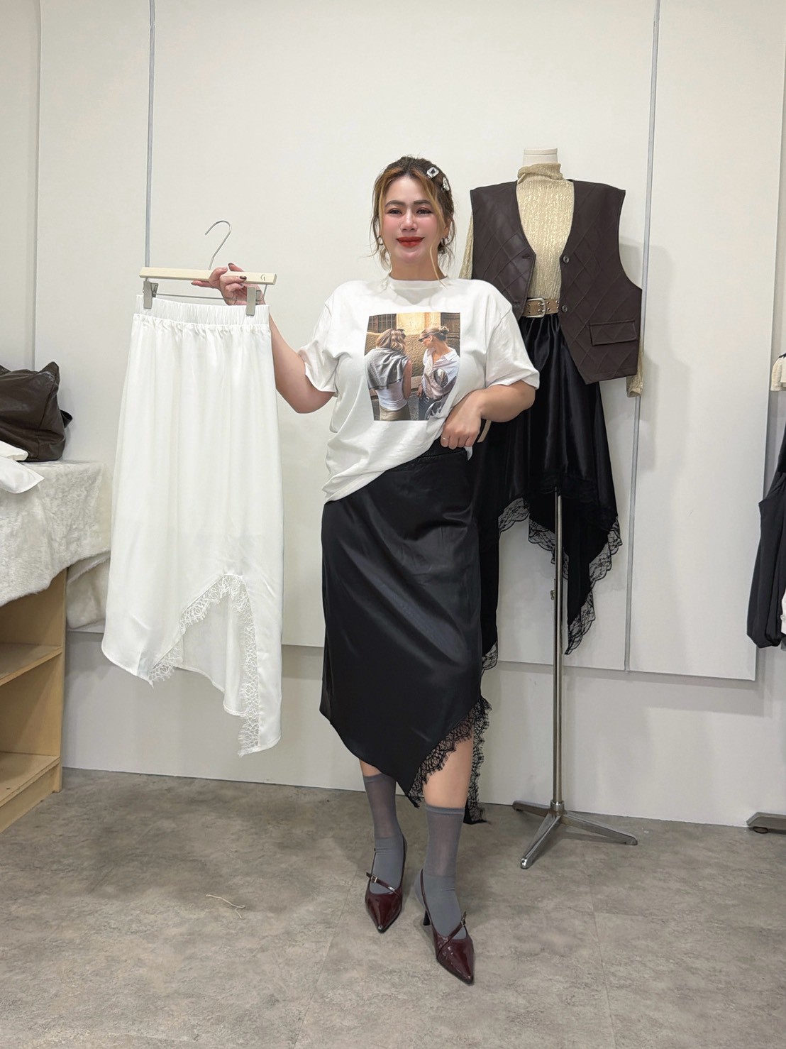 MEE41亮亮緞面斜擺蕾絲裙