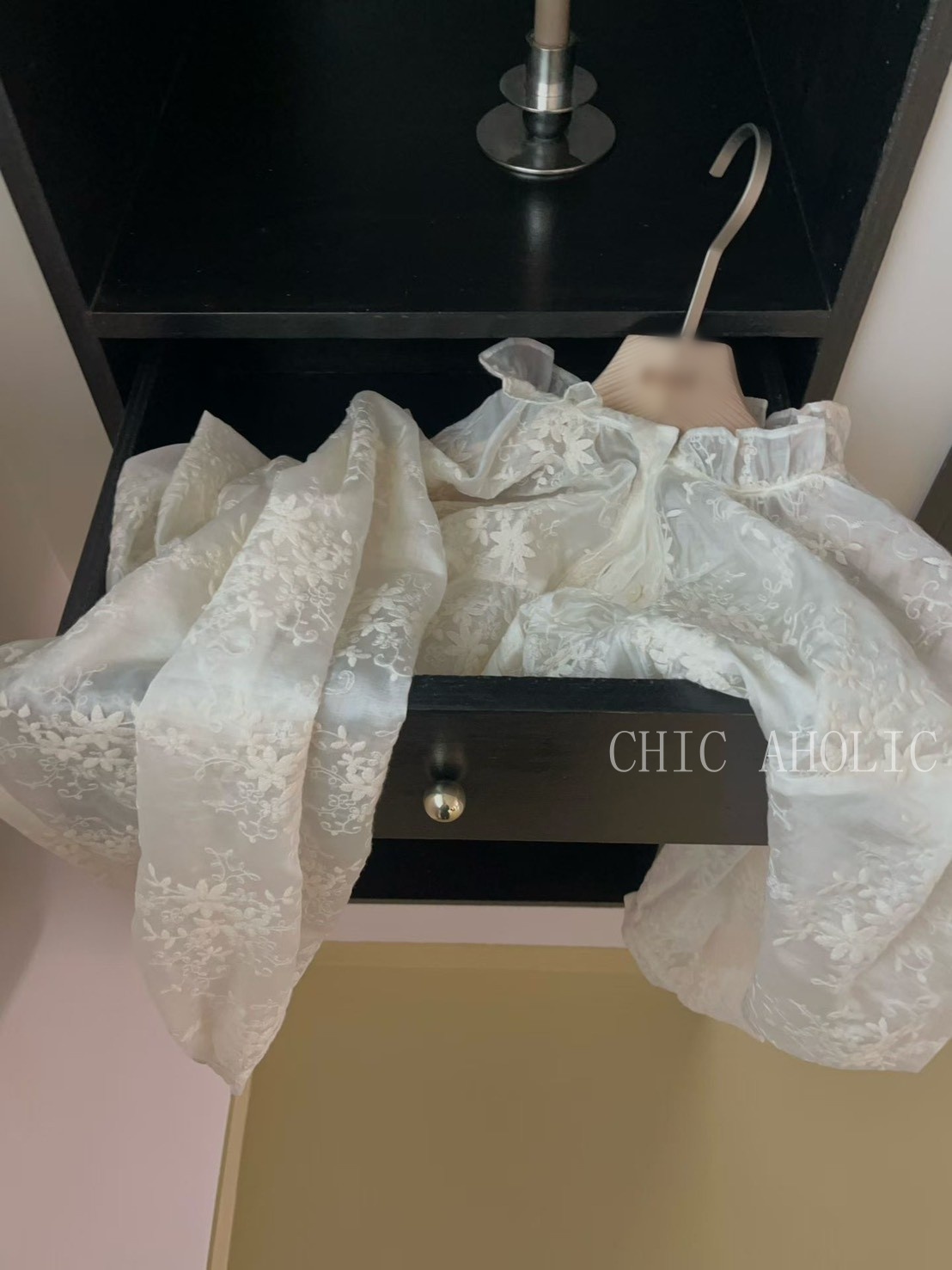 法式波浪領蕾絲澎袖上衣