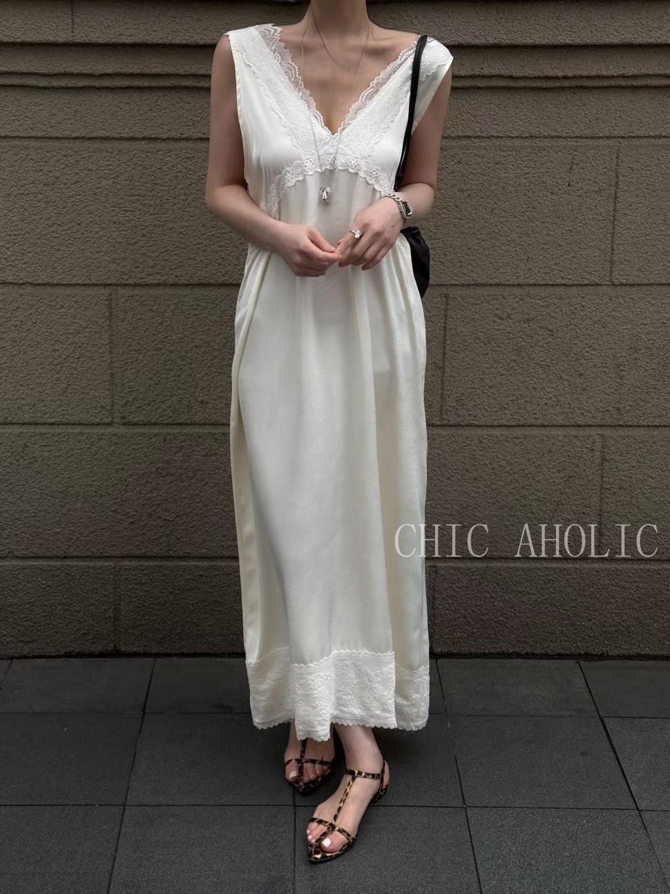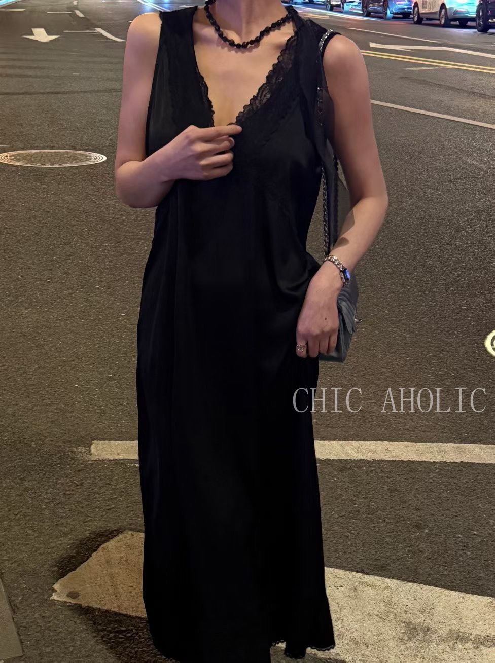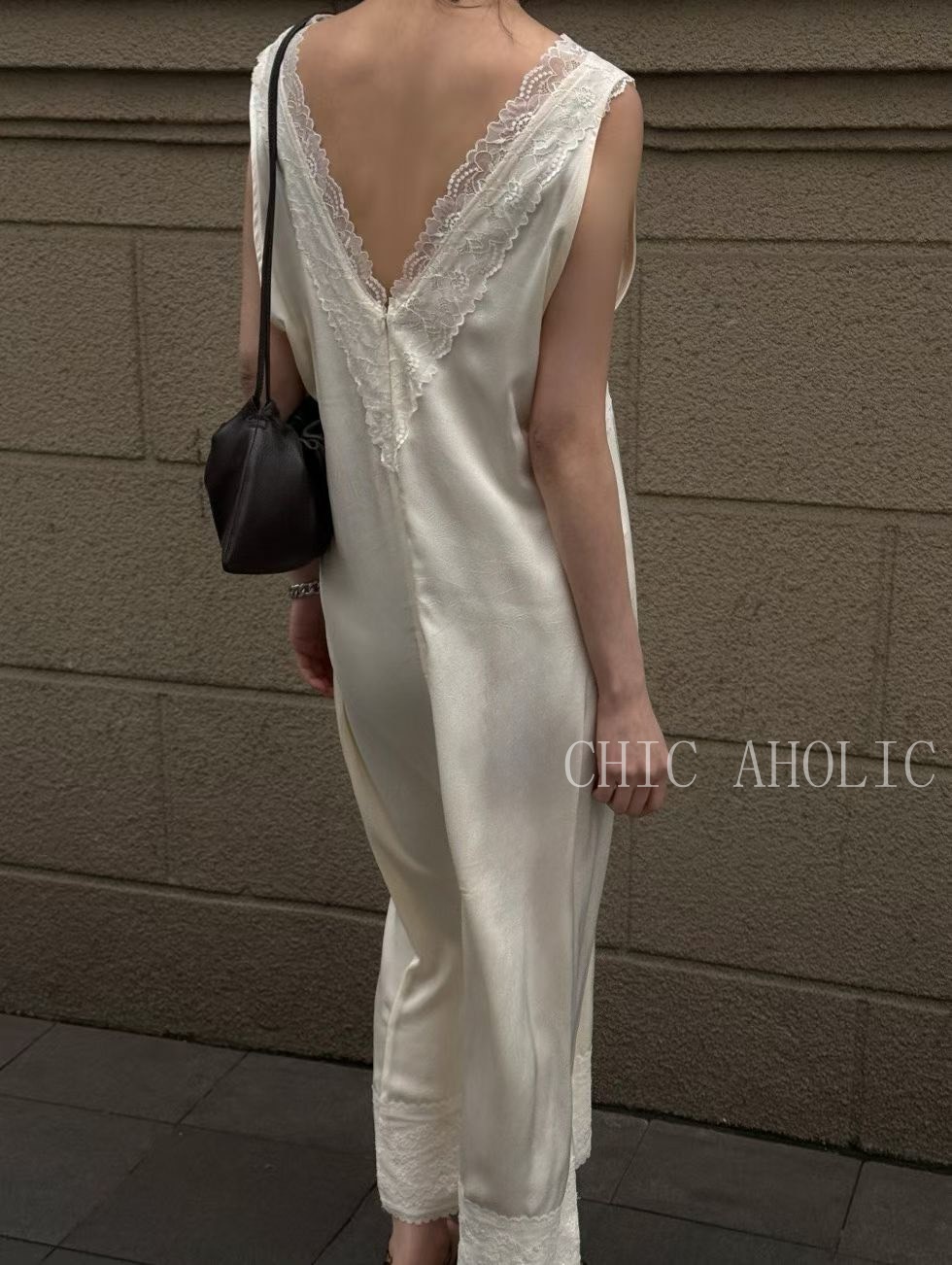WR34大寬肩V領緞面洋裝