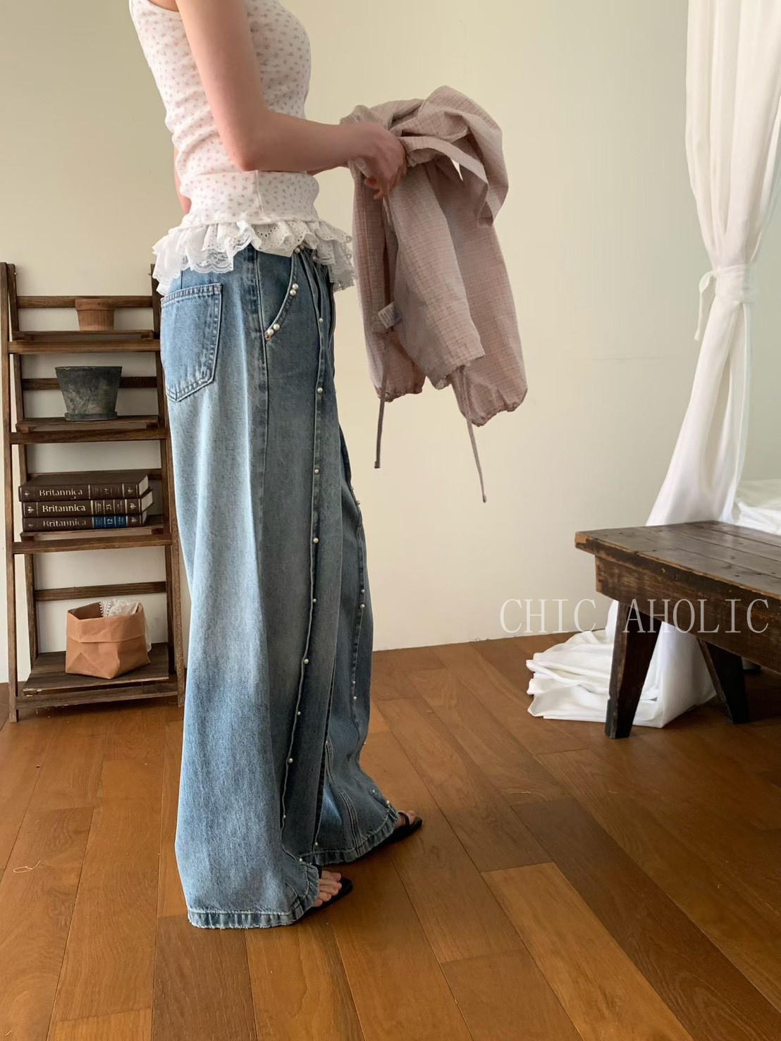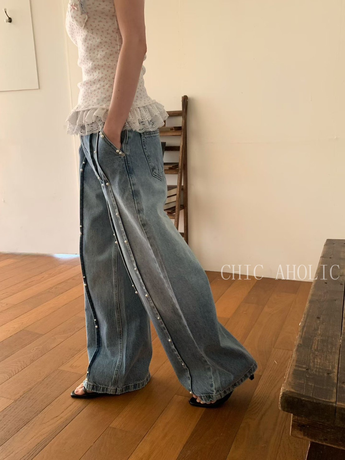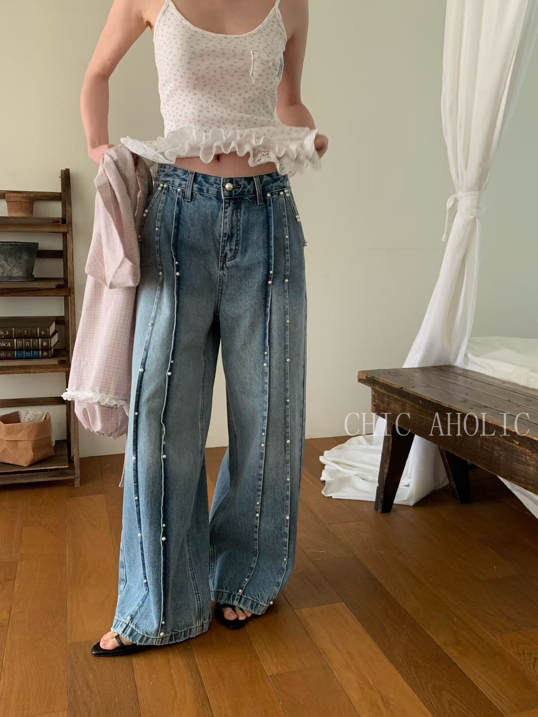 雙直排珍珠直筒牛仔褲