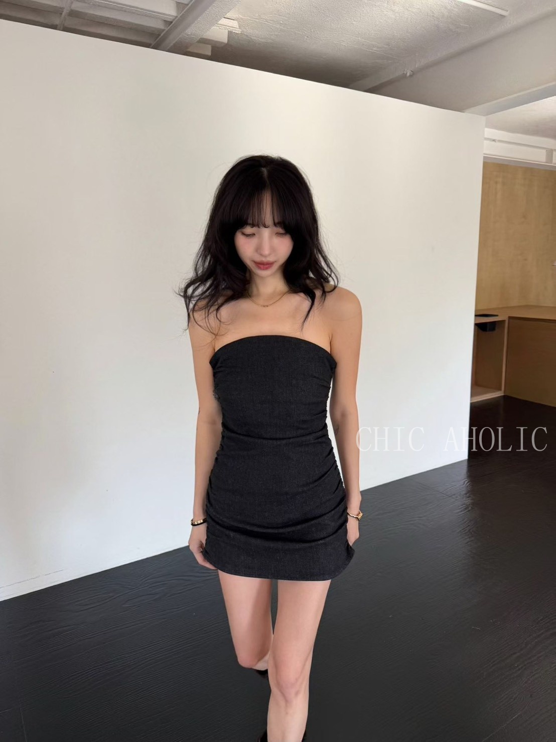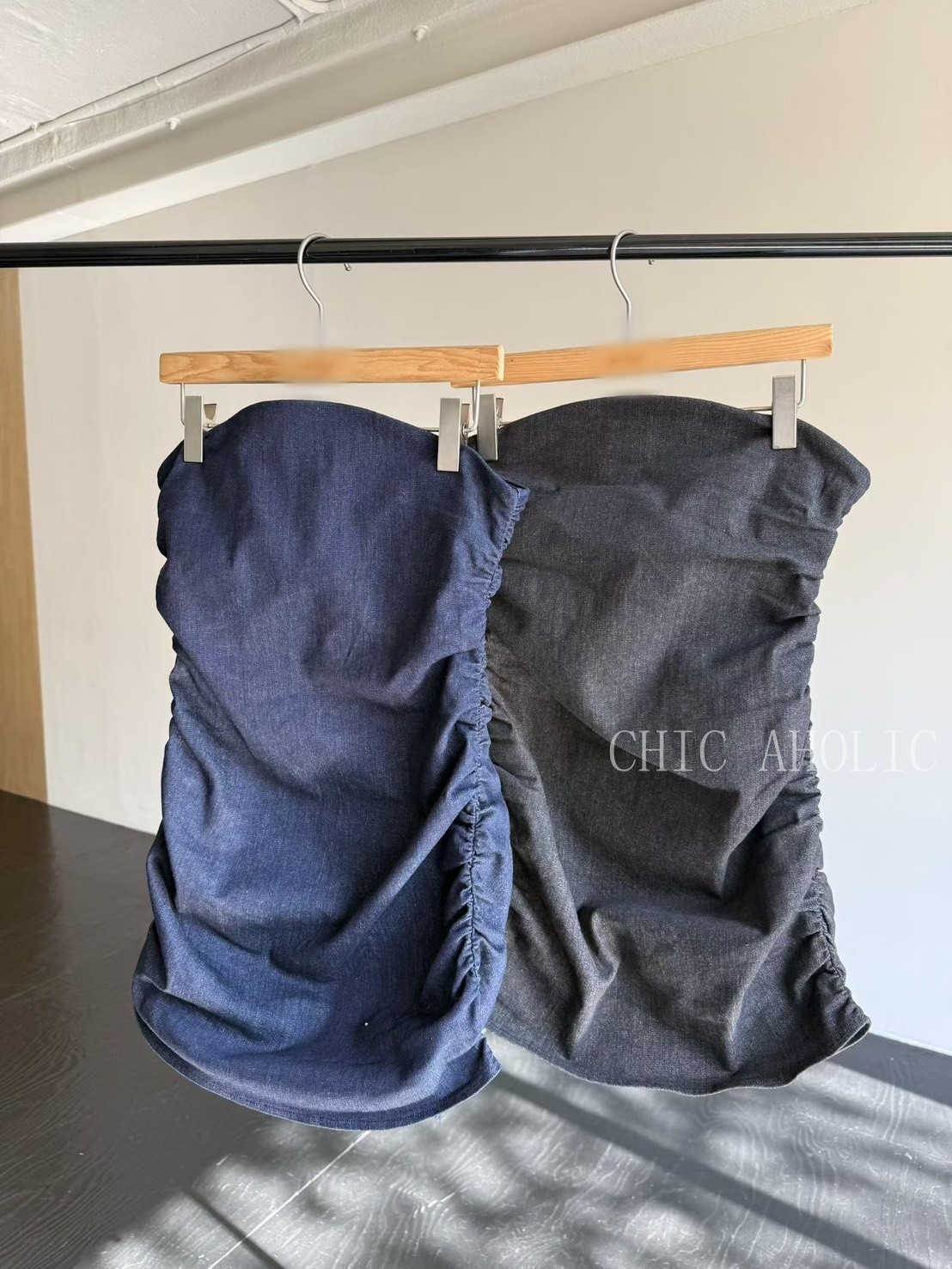 牛仔平口腰身短洋