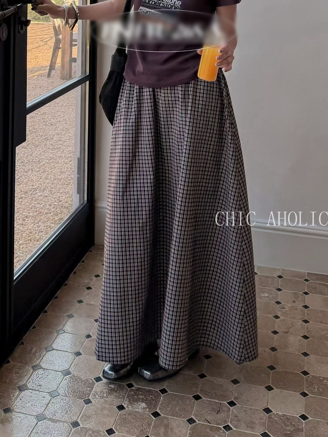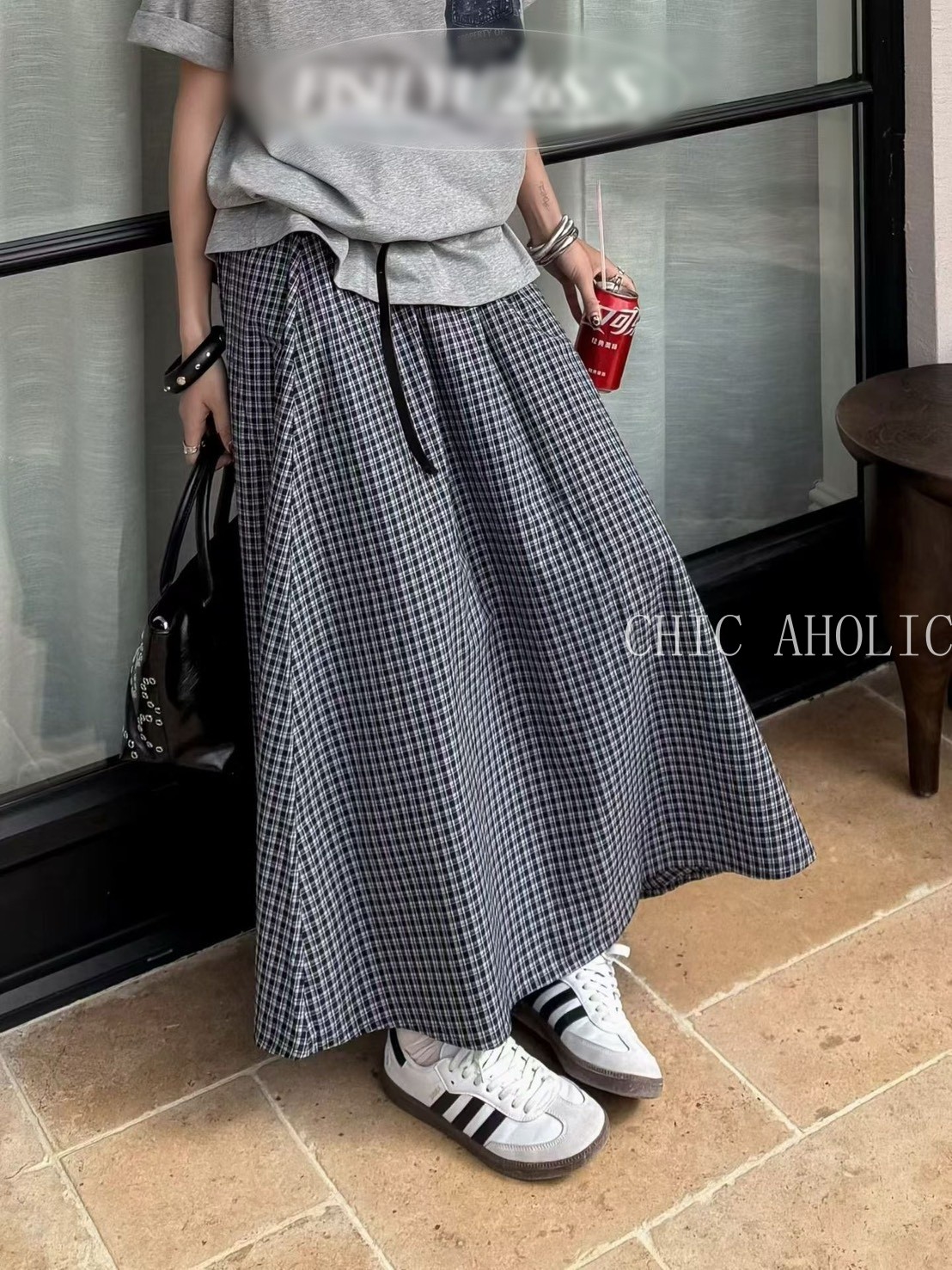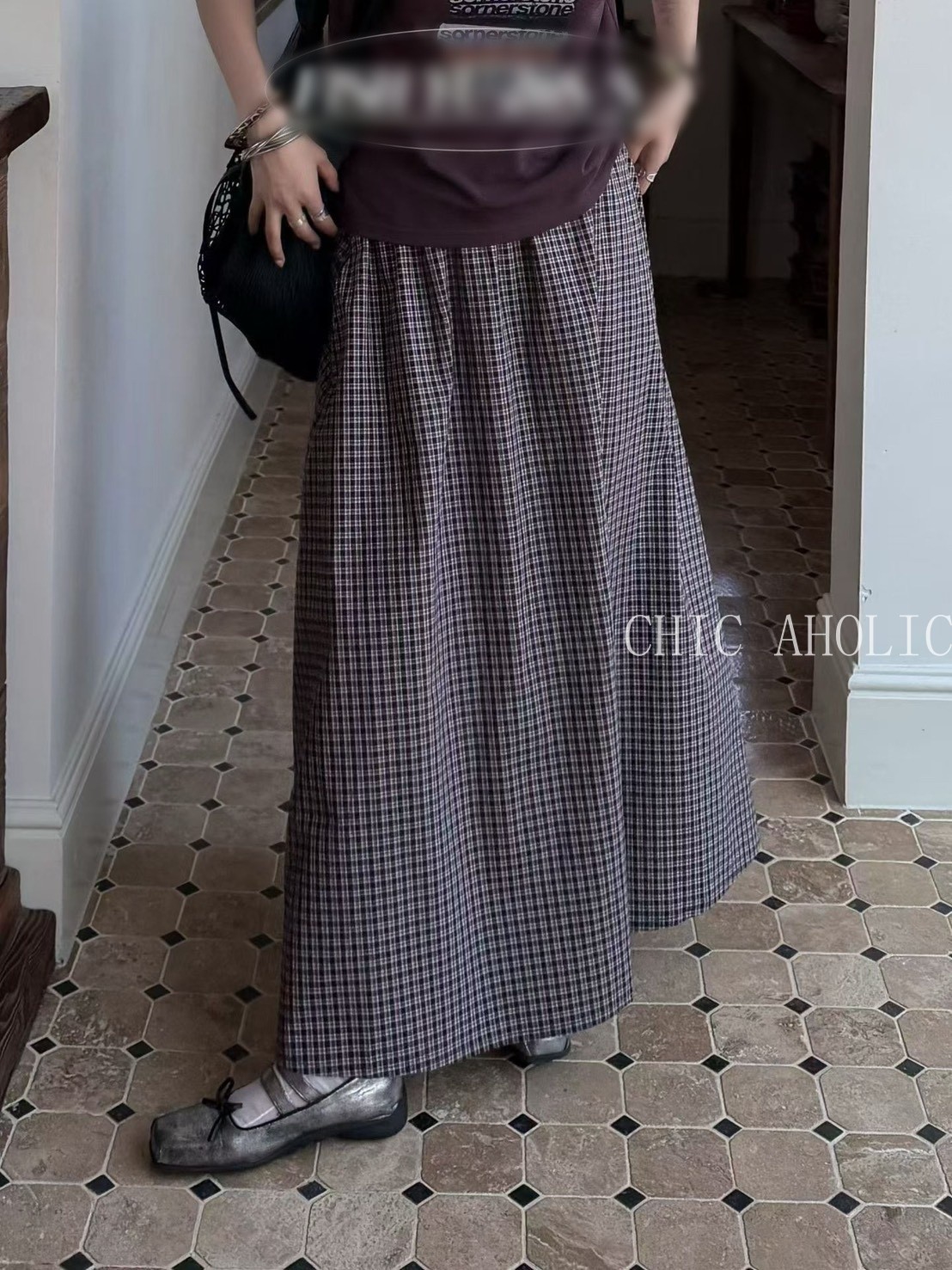 HE65黑白格鬆緊裙頭長裙