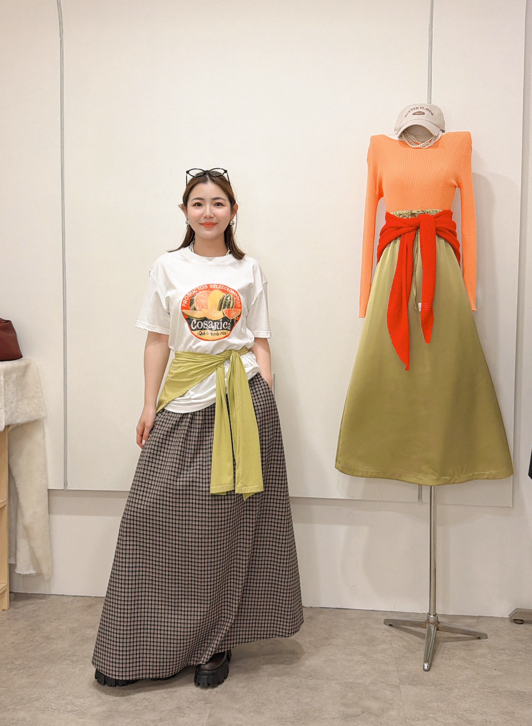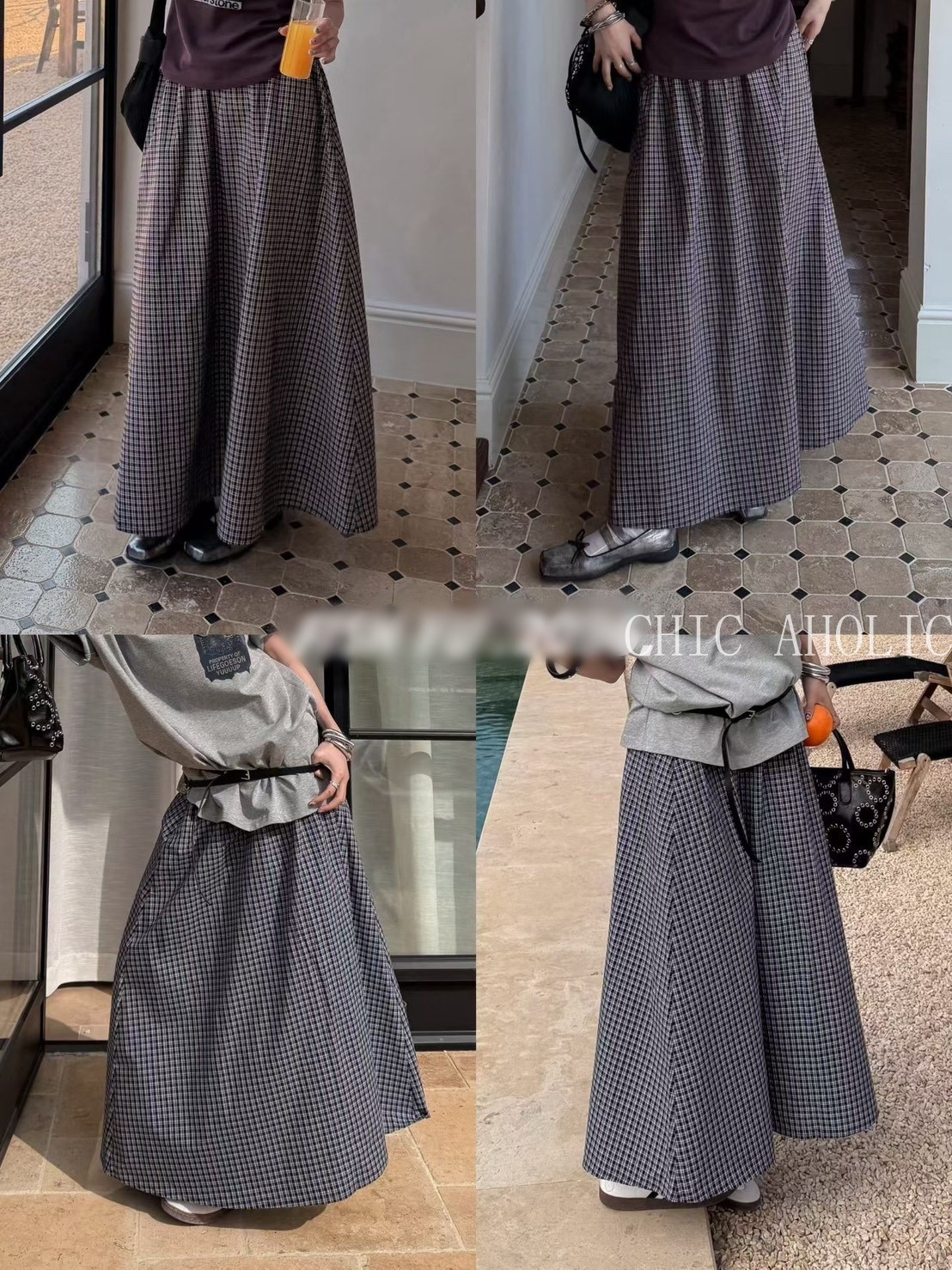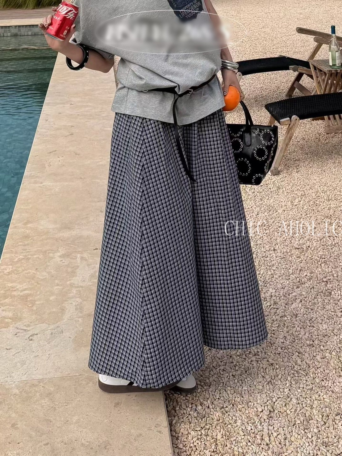 HE65黑白格鬆緊裙頭長裙